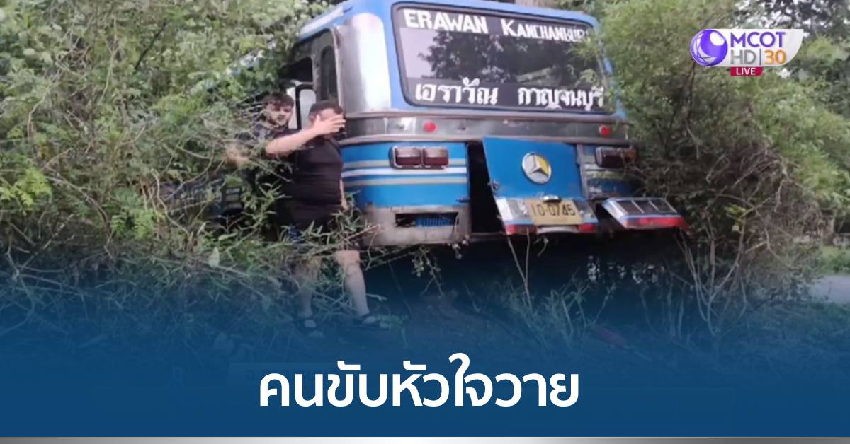 กาญจนบุรี 15 ก.ย. – ระทึกกันทั้งคัน โชเฟอร์รถบัสโดยสารสายเอราวัณ- กาญจนบุรี หัวใจวายเฉียบพลัน ขณะขับรถ นักท่องเที่ยวทั้งชาวไทยและต่างชาติที่นั่งมาในรถร้องกรี๊ดสนั่น ก่อนรถเสียหลักพุ่งชนกระบะ ตกลงข้างทาง รถพุ่งเข้าพุ่มไม้ คนขับเสียชีวิต ส่วนผู้โดยสารได้รับบาดเจ็ดคนละเล็กละน้อย