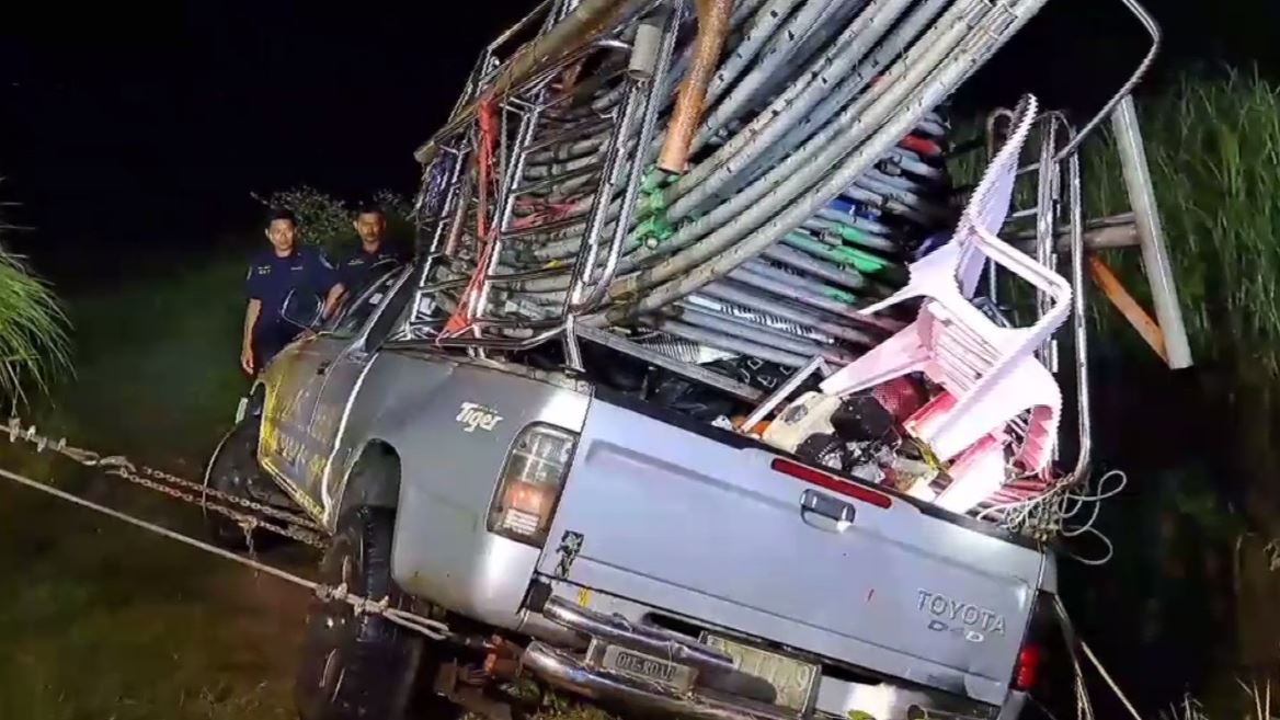 อุบัติเหตุรถกระบะพลิกคว่ำหงายท้องล้อชี้ฟ้า ตกอยู่ในคูน้ำข้างถนน บริเวณถนนท้ายซอย 22 เจ็ดเสมียน หมู่ 4 ต.เจ็ดเสมียน อ.โพธาราม จ.ราชบุรี เจ้าหน้าที่นำรถยกมาช่วยดึงขึ้นจากคูน้ำ พบด้านหลังรถมีอุปกรณ์ทำบ้านลม และอุปกรณ์ทาสีตุ๊กตา ส่วนภายในรถพบศพชาย ทราบชื่อ นายณัฐวุฒิ อายุ 59 ปี สภาพคอหัก