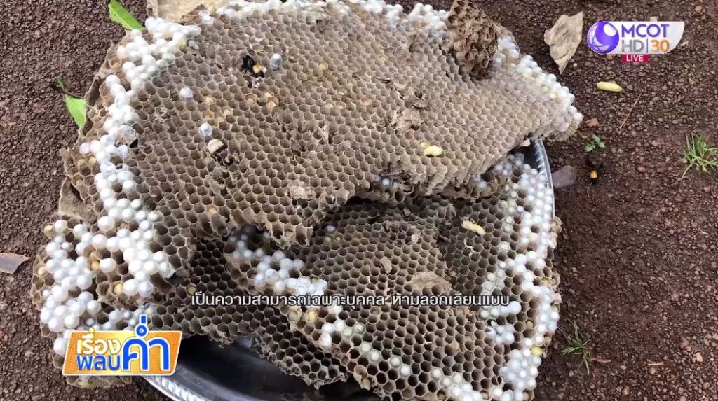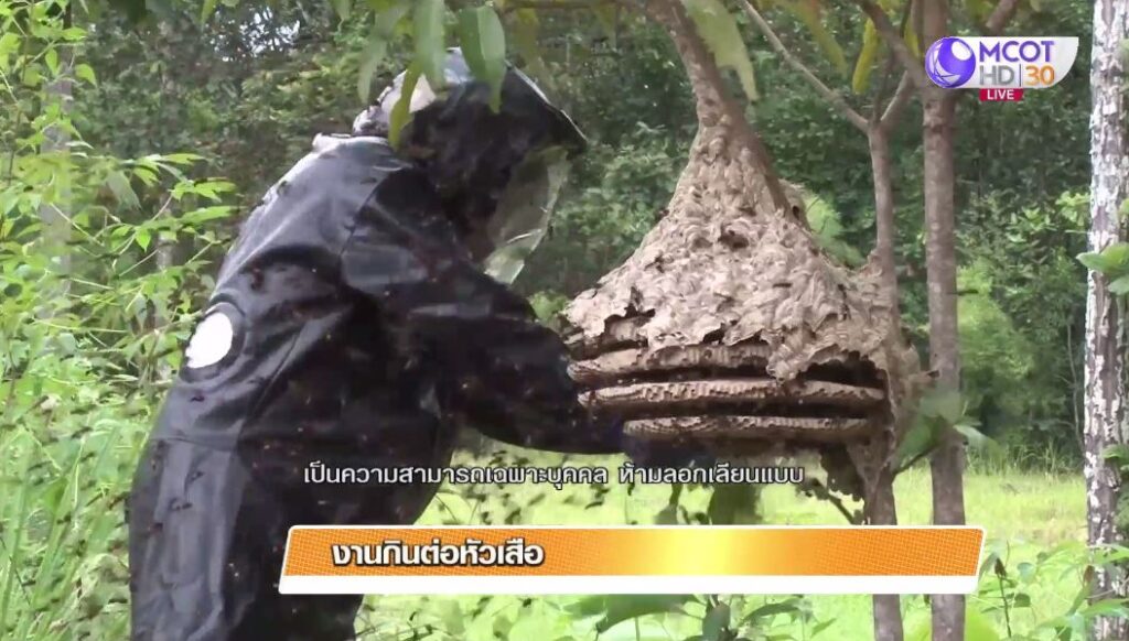 ชาวบ้านยังได้สาธิตวิธีเอารังต่อหัวเสือเอามาทำอาหาร ต้องสวมชุดที่ตัดเย็บพิเศษป้องกันต่อหัวเสือต่อย เสี่ยงตายเข้าไปล้วงเอาลูกต่อหัวเสือ แทนการรมควัน เนื่องจากสามารถให้ผลผลิตถึง 2-3 รอบจากเคยเก็บได้แค่รอบเดียว และยังลดการสูญพันธุ์ของแม่ต่อหัวเสือเพิ่มมูลค่าอีกด้วย โดยใช้มีดค่อยๆ ตัดรังออกมาทีละชั้น ก่อนเอามาทำอาหาร อาทิ แกงอ่อมลูกต่อ ก้อยลูกต่อหัวเสือ ซึ่งนายสมศักดิ์ บุญจันทร์ นายอำเภอปลาปาก ถึงกับลงมือทำอาหารโชว์ด้วยตัวเอง ทั้งแกงออมต่อ ก้อนต่อ พร้อมท้านักท่องเที่ยวมาท้าชิม