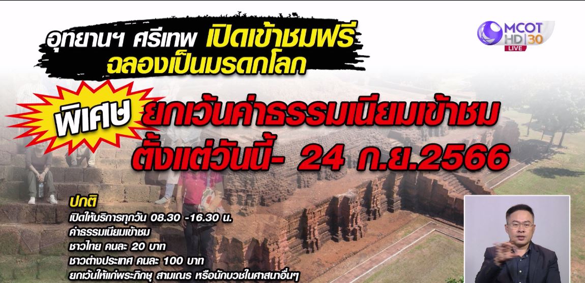 เพชรบูรณ์ 20 ก.ย. – หลังจากยูเนสโกประกาศให้เมืองโบราณศรีเทพ ของประเทศไทย เป็นมรดกโลกทางวัฒนธรรม ในการประชุมคณะกรรมการมรดกโลก ที่ซาอุดีอาระเบีย ขณะที่กรมศิลปากร ประกาศยกเว้นค่าธรรมเนียมเข้าชมอุทยานประวัติศาสตร์ศรีเทพ จ.เพชรบูรณ์ ระหว่างวันที่ 20 – 24 กันยายน 2566 เพื่อร่วมเฉลิมฉลองการประกาศขึ้นทะเบียนเมืองโบราณศรีเทพ
