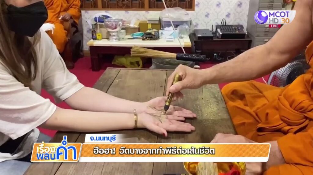 ที่วัดบางจาก ต.คลองพระอุดม อ.ปากเกร็ด จ.นนทบุรี ทำพิธีต่อเส้นชีวิต ต่อเส้นวาสนา โดยใช้ปากกาสีทองเขียนที่ฝ่ามือทั้ง 2 ข้าง เพื่อให้เกิดพุทธคุณเสริมบารมี หนุนดวง และเสริมสิริมงคลให้ชีวิต