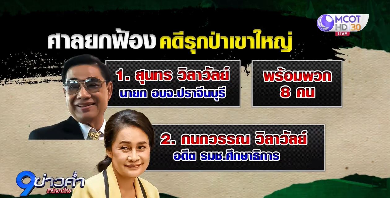 ระยอง 21 ก.ย. – ศาลอาญาคดีทุจริตฯ ยกฟ้อง “สุนทร-กนกวรรณ” กับพวกรวม 10 คน คดีบุกรุกที่ดินป่าสงวนแห่งชาติเขาใหญ่