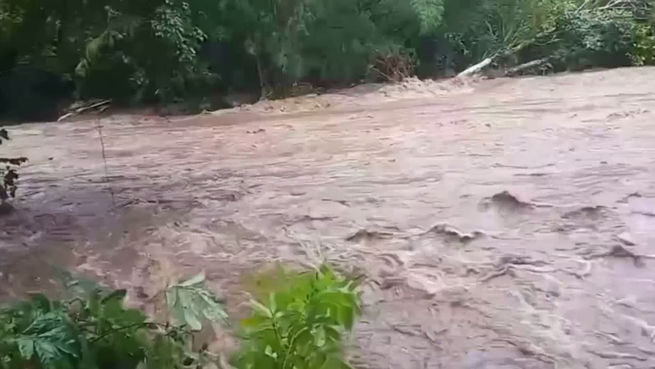 ส่วนพื้นที่ อ.มะขาม ที่บ้านคลองขวางพัฒนา หมู่ 9 ต.ปัถวี บริเวณสะพานซอยบ้านคลองขวาง น้ำเปลี่ยนสี กระแสน้ำไหลเชี่ยว ระดับน้ำล้นตลิ่งท่วมสวนผลไม้ทั้งสองฝั่ง. – สำนักข่าวไทย