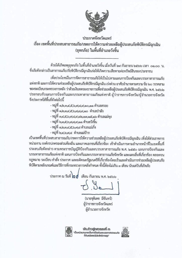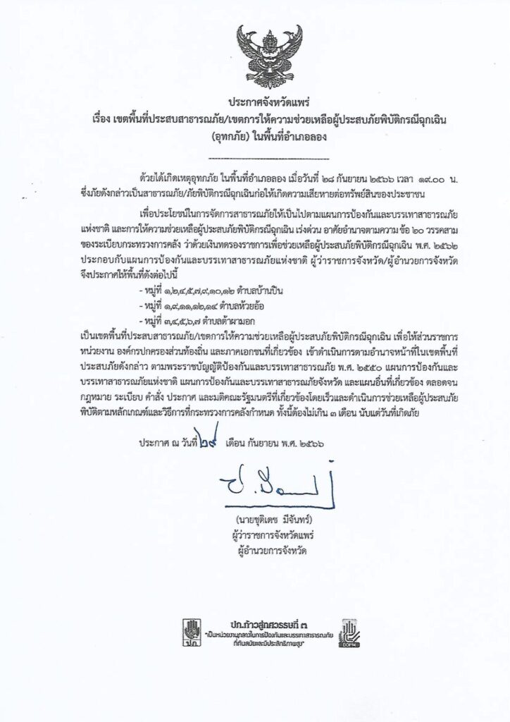 แพร่ 30 ก.ย.-ผู้ว่าฯ แพร่ ประกาศให้ อ.ลอง และวังชิ้น เป็นเขตพื้นที่ประสบสาธารณภัย เขตการให้ความช่วยเหลือผู้ประสบภัยพิบัติกรณีฉุกเฉิน จากกรณีอุทกภัย
