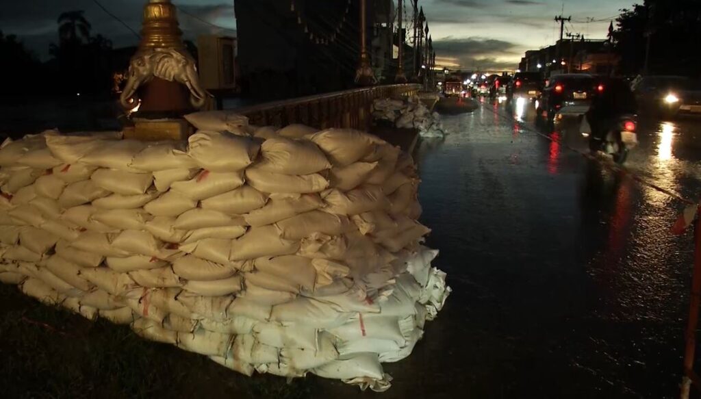 ริมลำน้ำยม บริเวณสะพานพระร่วง กลางเมืองสุโขทัย ซึ่งเป็นย่านเศรษฐกิจ จะเห็นสภาพของแม่น้ำยมที่ไหลผ่านตัวเมืองสุโขทัย ซึ่งเห็นได้ว่าระดับผิวน้ำยังแตะท้องสะพานพระร่วง แต่ระดับน้ำยังห่างจากบริเวณพนังกั้นน้ำบริเวณนี้เกือบ 1 เมตร และทรงตัวในระดับสูง ประมาณ 7.30 เมตร เจ้าของร้านค้าในตัวเมืองบางส่วนเตรียมพร้อมรับสถานการณ์ วางกระสอบทรายป้องกันน้ำท่วม หากน้ำล้นพนังกั้นน้ำ
