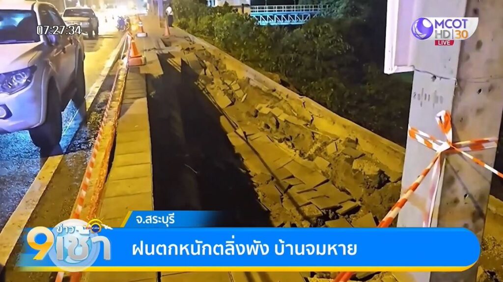 สืบเนื่องจาก เมื่อวานนี้ (4 ต.ค.) ในพื้นที่ จ.สระบุรี มีฝนตกเป็นบริเวณกว้าง ทำให้มวลน้ำในแม่น้ำป่าสักมีปริมาณมาก และสูงขึ้น ซึ่งปริมาณน้ำดังกล่าวมีกำลังแรง และเร็ว จึงกัดเซาะผนังดินริมตลิ่งพังยาวกว่า 100 เมตร และทรุดลงมา ลึกราว 50 เมตร ไหลผ่านแม่น้ำป่าสัก ซึ่งเป็นที่เกิดเหตุ ประกอบกับบริเวณดังกล่าวเป็นทางโค้งของแม่น้ำ