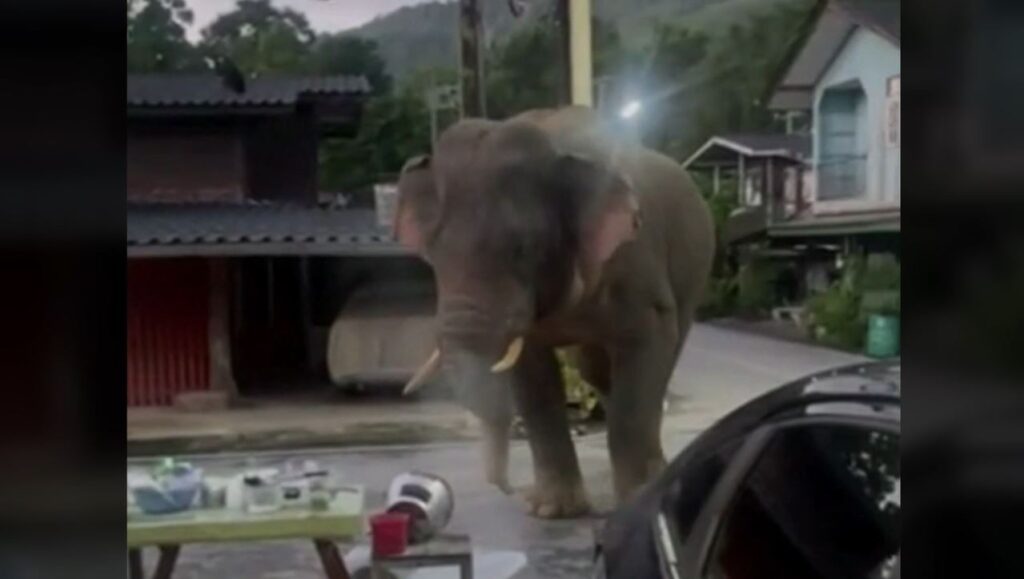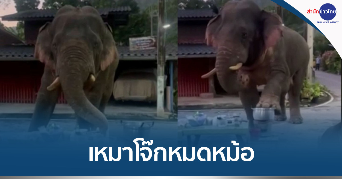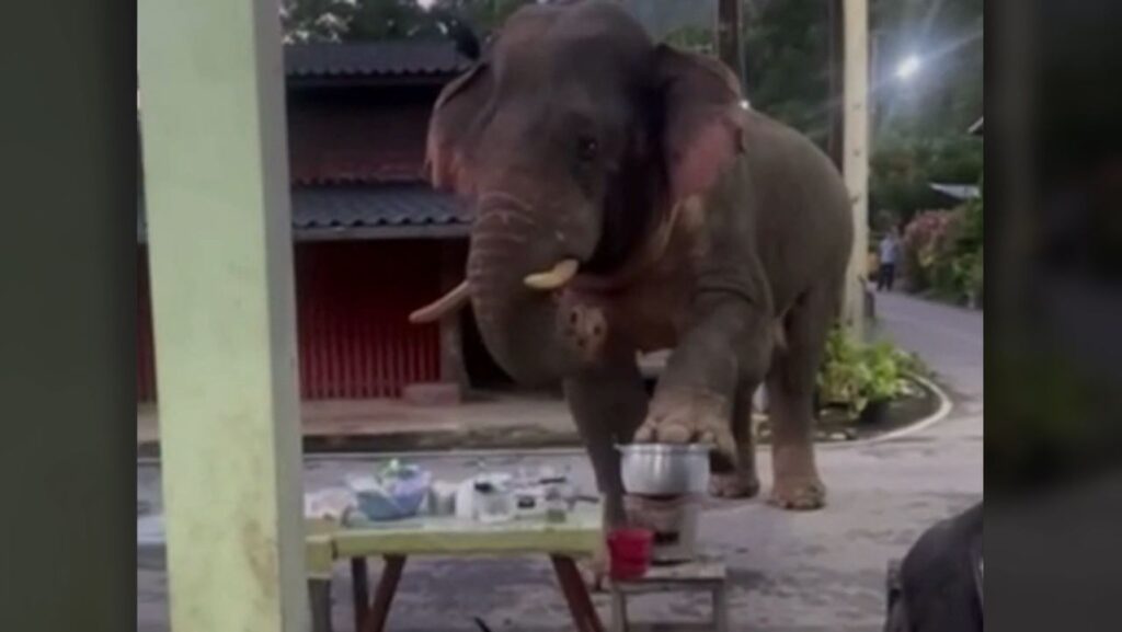 นครราชสีมา 6 ต.ค. – พลายเบี่ยงเล็ก ช้างป่าเขาใหญ่ อยากชิมโจ๊ก ใช้เท้าเหวี่ยงหม้อคว่ำลงพื้น แล้วใช้งวงกวาดกินโจ๊กร้อน ๆ ก่อนเดินจากไป
