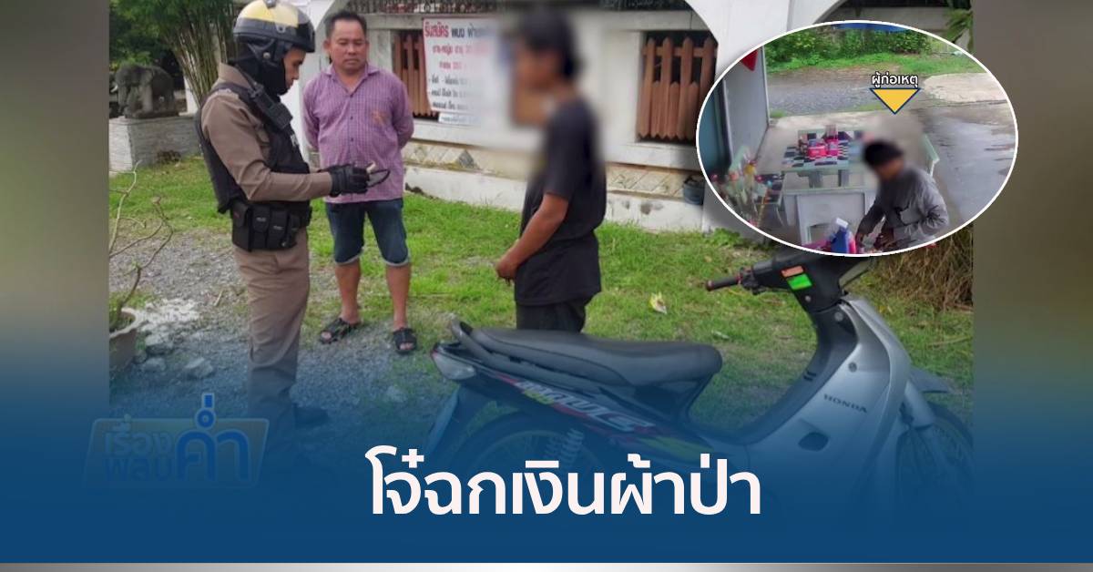 กล้องวงจรปิดร้านขายอาหารตามสั่ง ต.หนองเพรางาย อ.ไทรน้อย จ.นนทบุรี จับภาพคนร้ายเป็นชาย ขี่รถจักรยานยนต์เข้ามาขโมยเงินจากถังผ้าป่าที่วางไว้หน้าร้านได้อย่างชัดเจน