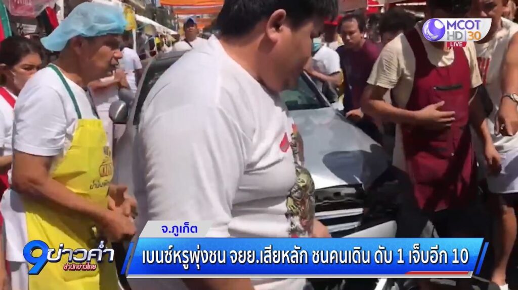 ภูเก็ต 12 ต.ค. – อุบัติเหตุเศร้า รถหรูพุ่งชนรถ จยย. ก่อนเสียหลักชนคนเดินและรถยนต์ หน้าวัดขจรรังสรรค์ภูเก็ต ดับ 1 เจ็บอีก 10 ซุ้มขายอาหารเจเสียหาย