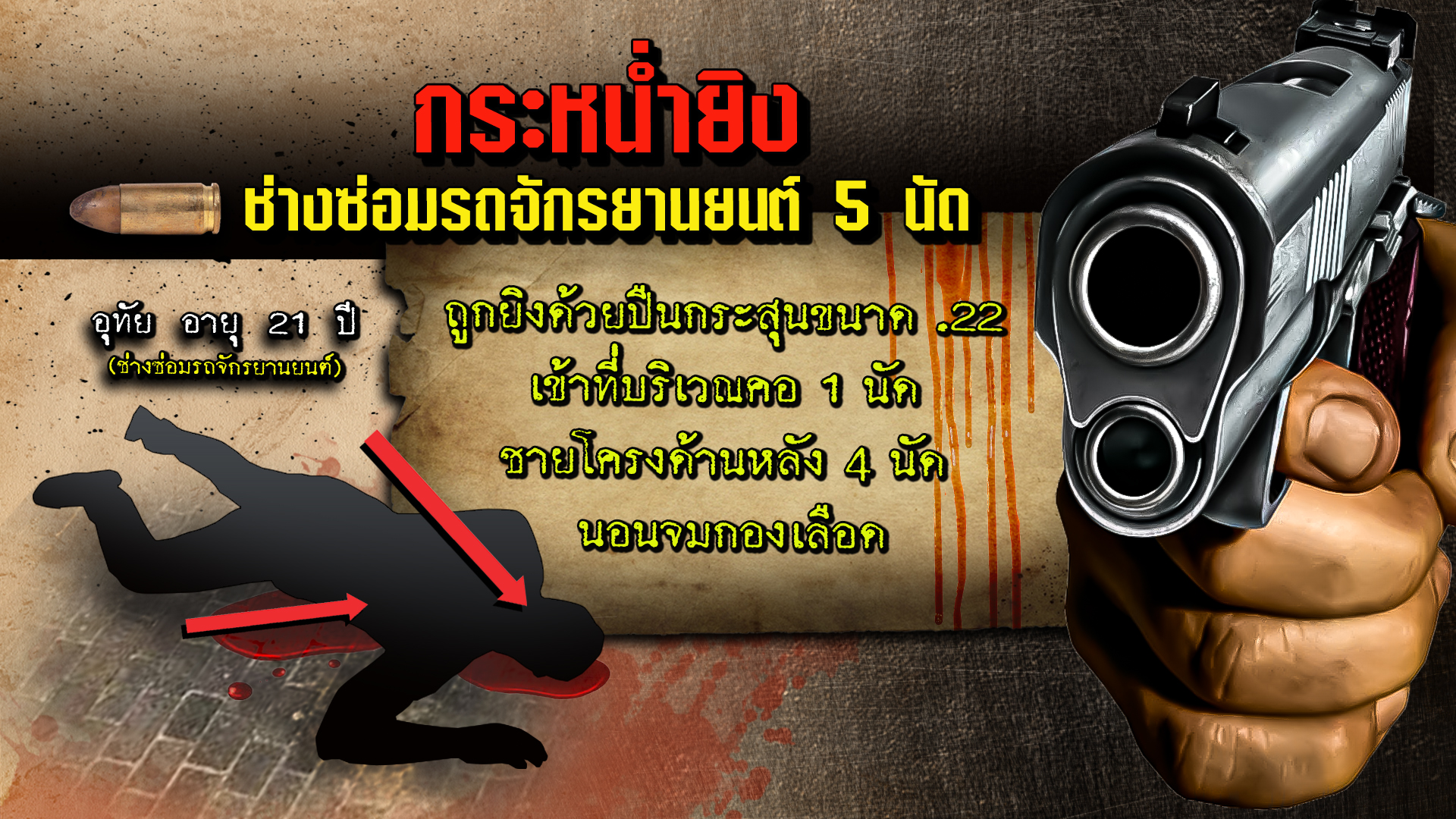 เจ้าหน้าที่กู้ภัยรีบนำตัวนายอุทัย อายุ 21 ปี ซึ่งเป็นช่างซ่อมรถจักรยานยนต์ ถูกยิงด้วยปืนกระสุนขนาด .22 เข้าที่บริเวณคอ 1 นัด ชายโครงด้านหลัง 4 นัด นอนจมกองเลือดอยู่บริเวณหน้าร้านขายของชำ ใกล้กับร้านขายไก่ย่าง ต.สามชุก อ.สามชุก จ.สุพรรณบุรี อาการสาหัส ส่งโรงพยาบาล เจ้าหน้าที่พิสูจน์หลักฐานและตำรวจ สภ.สามชุก เข้าตรวจสอบที่เกิดเหตุ