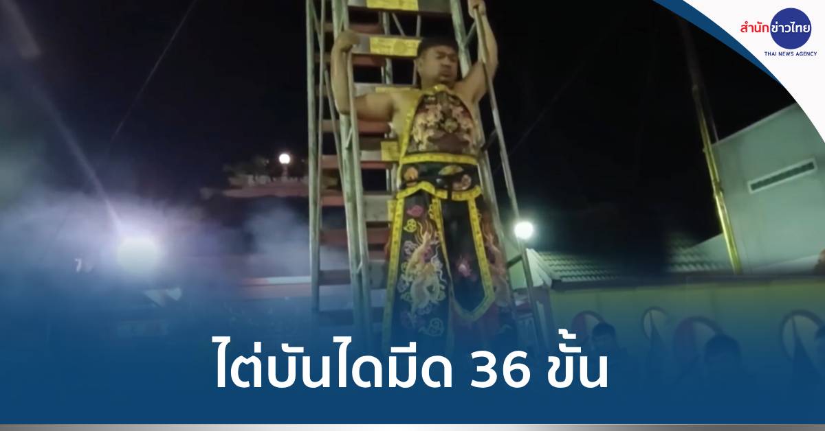 เมื่อวานนี้ ที่ศาลเจ้ากิวอ่องเอี่ย ต.ทับเที่ยง อ.เมือง จ.ตรัง เป็นศาลเจ้าเก่าแก่อายุกว่า 160 ปี อยู่ในช่วงของงานประเพณีถือศีลกินเจประจำปี 2566 โดยปีนี้ได้ประกอบพิธีไต่บันไดมีด เป็นครั้งแรกในรอบ 13 ปี หลังได้รับได้อนุญาตจากองค์ศักดิ์สิทธิ์กิวอ่องไต่ไต่ และเจ้าที่เจ้าทางซึ่งเป็นเจ้าของสถานที่ โดยได้อัญเชิญองค์ศักดิ์สิทธิ์ต่างๆ กว่า 50 องค์ ประทับร่างม้าทรงที่มีประสบการณ์ในการไต่บันไดมีดมาประกอบพิธี ก่อนที่ม้าทรงจะไต่บันไดมีดขึ้นไปทีละขั้นซึ่งมีทั้งหมด 36 ขั้น ซึ่งหมายถึง 36 ชั้นฟ้า และมีความสูง 13 เมตร เพื่อนำธงสีประจำทิศทั้ง 5 ทิศรวม 5 สี คือสีเหลือง สีเขียว สีขาว สีดำ และสีแดง ที่ปักอยู่ข้างบนสุด รวมทั้งเต็งลั้ง (โคมไฟ) ดวงใหญ่ 2 ดวง เต็งลั้งดวงเล็ก 18 ดวงลงมาข้างล่าง ให้บรรดาผู้มีจิตศรัทธาได้นำไปสักการบูชา โดยเชื่อว่าหากใครได้ธงไปติดไว้ที่บ้าน จะทำให้กิจการเจริญก้าวหน้า ค้าขายรุ่งเรือง และมีแต่ความโชคดี