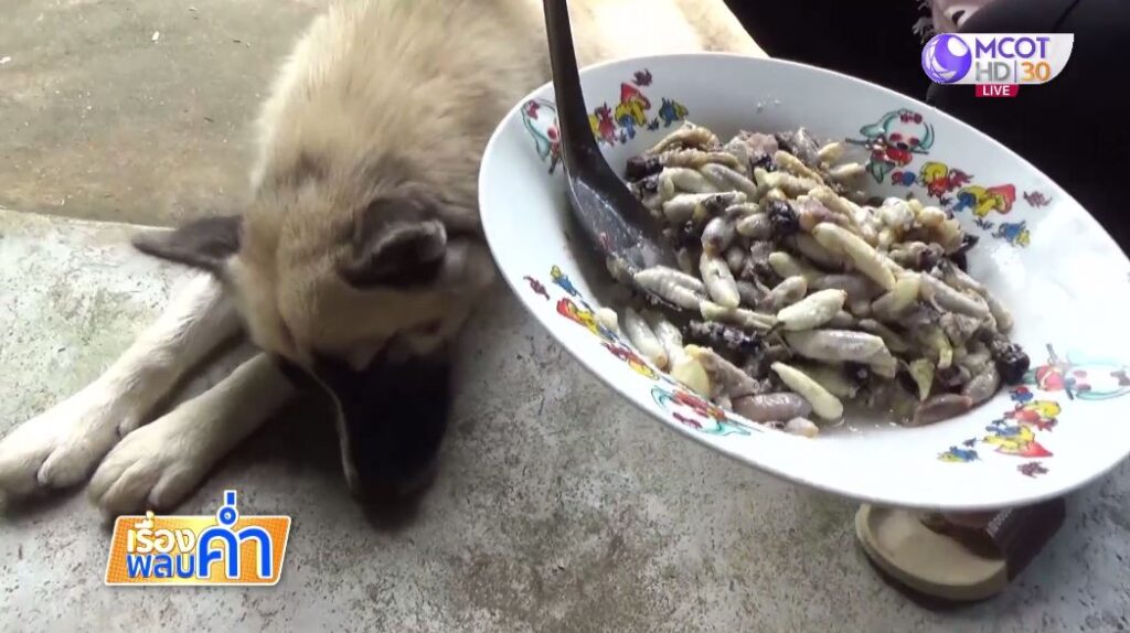 กลุ่มเกษตรกรผู้เลี้ยงต่อหัวเสือ กำลังช่วยกันเอาตัวอ่อนของต่อหัวเสือออกจากรัง เพื่อมาทำเมนูอาหารรับประทานกันในกลุ่มสมาชิกฯ โดยมีน้องใบบัว สุนัขพันธุ์ไซบีเรียนสีน้ำตาลอ่อน เพศเมีย อายุ 2 ปี มานั่งเฝ้านอนเฝ้าอยู่ไม่ห่าง ยิ่งได้กลิ่นผัดต่อหัวเสือจนสุกหอม ทำเอาน้องใบบัวถึงกับน้ำลายไหล นั่งมองเจ้าของตาปริบ ๆ
