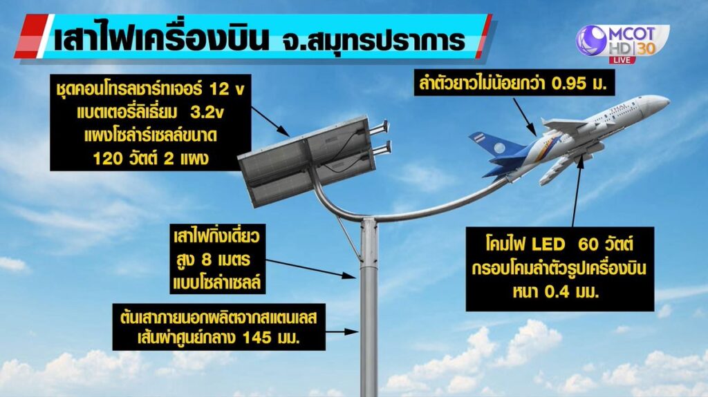ผู้สื่อข่าวลงพื้นที่ พบถนนสองเลนกว้าง 6 เมตร ติดตั้งเสาไฟฟ้าประติมากรรรมรูปเครื่องบินทั้งหมด 354 ต้น ราคาต้นละ 92,715.50 บาท เป็นเสาไฟกิ่งเดี่ยว สูง 8 เมตร แบบโซลาร์เซลล์ หรือ พลังงานแสงอาทิตย์ ต้นเสาภายนอกผลิตจากสแตนเลสเส้นผ่าศูนย์กลางไม่น้อยกว่า 145 มม. โคมไฟประหยัดพลังงานหลอด LED ขนาดไม่น้อยกว่า 60 วัตต์ พร้อมกรอบโคมบรรจุอยู่ภายในลำตัวรูปจำลองเครื่องบิน อัดขึ้นรูปลำตัวเครื่องบินด้วยสแตนเลส หนา 0.4 มม. ขนาดลำตัวยาวไม่น้อยกว่า 0.95 ม. ชุดคอนโทรลชาร์จเจอร์ 12 V แบตเตอรี่ลิเธียม ขนาด 3.2 V แผงโซลาร์เซลล์ขนาด 120 วัตต์ 2 แผง พร้อมโครงเหล็กยึดแผง ฐานเสาไฟฟ้าชนิดเข็มเจาะ โดยการติดตั้งเสาไฟทั้งสองฝั่งจะสลับเป็นฟันปลา ระยะความห่างต่อเสา ประมาณ 15-20 เมตร
