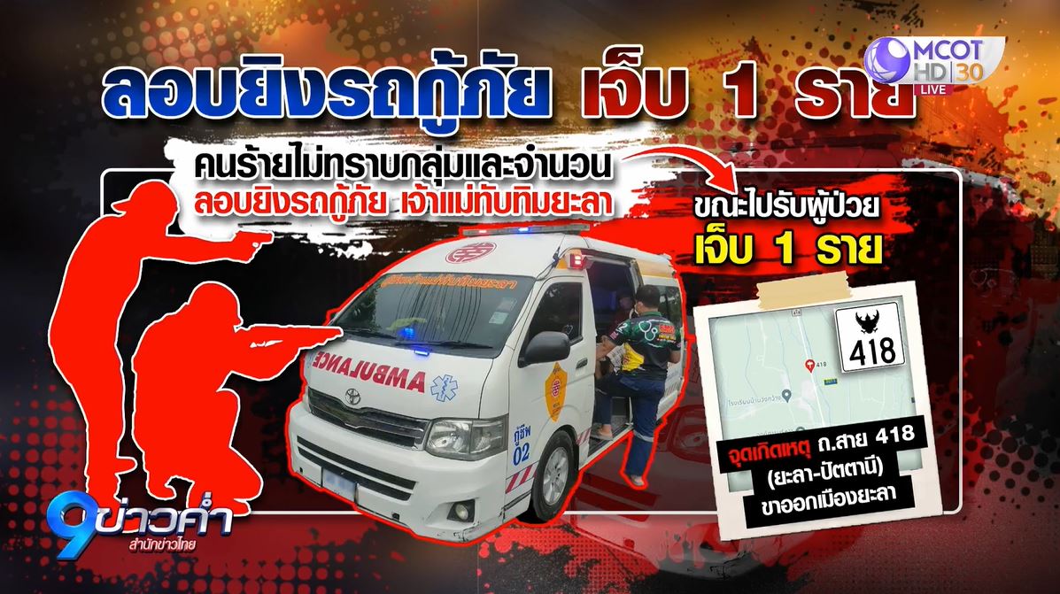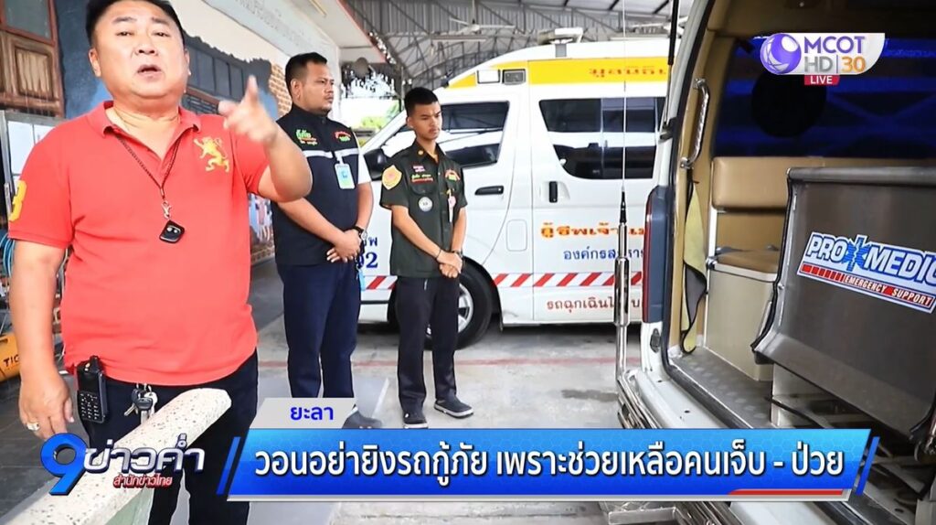 ยะลา 30 ต.ค. – ยิงรถกู้ภัยกลางดึก ขณะไปรับผู้ป่วยที่ยะลา ประธานมูลนิธิวอนคนร้าย ถ้าเห็นรถมีไฟสีแดง-น้ำเงิน ให้เว้นบ้าง เพราะวิ่งไปช่วยเหลือคน