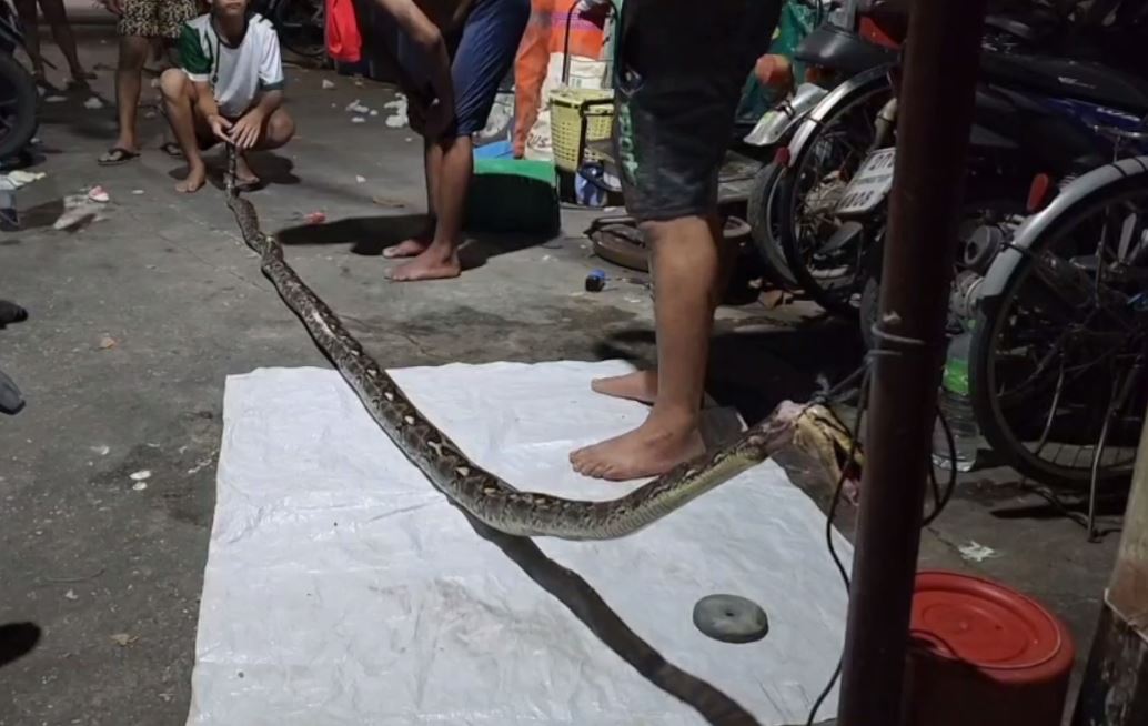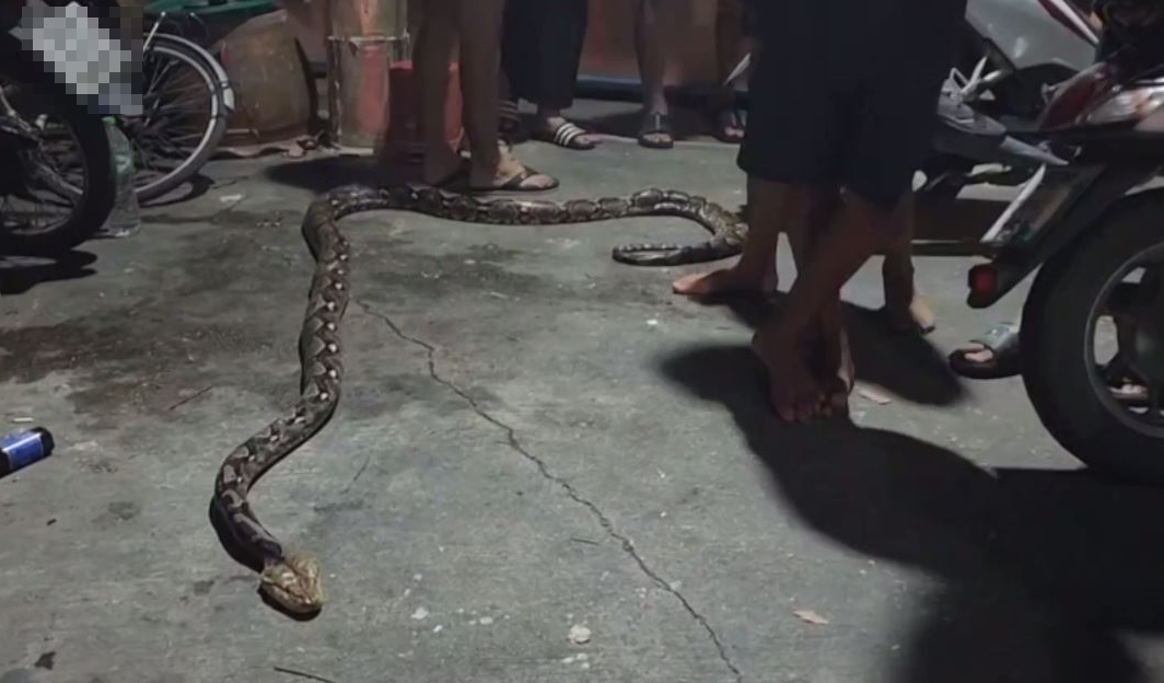 นี่เป็นงูเหลือม ความยาว 4 เมตร ที่มากัดขา นายดลนธี อายุ 39 ปี และที่เห็นชาวบ้านจับกันอย่างไม่เกรงกลัว เพราะงูเหลือมตัวนี้โดนตีตายแล้ว ส่วนนายดลนธี ถูกกัดที่ขาซ้าย ได้รับการปฐมพยาบาลเบื้องต้นแล้วเช่นกัน