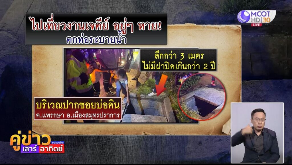 สมุทรปราการ 4 พ.ย. – เด็กวัย 13 ตกท่อระบายน้ำลึก 3 เมตร แต่เกาะขอบปากท่อไว้ทัน ระหว่างต่อรถไปเที่ยวงานเจดีย์ จ.สมุทรปราการ ชาวบ้านบอกท่อดังกล่าวไม่มีฝามาเป็นปีแล้ว