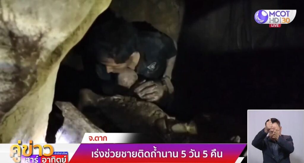 ตาก 5 พ.ย. – หนุ่มวัย 47 ปี พลัดตกติดในโพรงถ้ำภูเขาสูงชัน นาน 5 วัน 5 คืน ขึ้นไม่ได้ ทหารพรานและกู้ภัยท่าสองยาง เร่งให้การช่วยเหลือ แต่ยังไม่สามารถนำตัวขึ้นมาได้