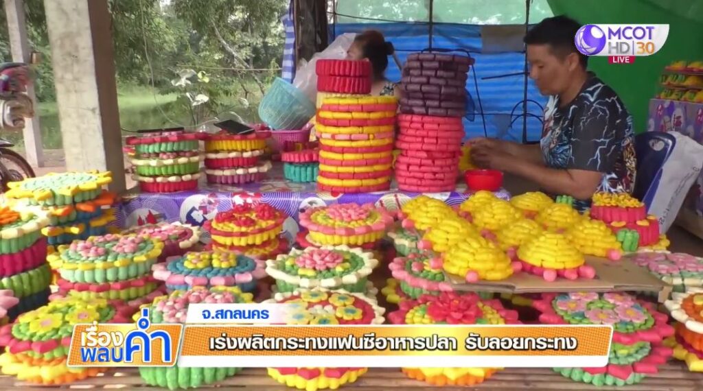 ส่วนที่สกลนคร กลุ่มพ่อค้าแม่ค้าในร้านค้าริมทางถนนบ้านหนองยาง ต.พังขว้าง อ.เมือง อาศัยเวลาว่างจากการขายของ เร่งผลิตกระทงแฟนซีอาหารปลา สร้างรายได้เสริม โดยมีรูปแบบหลากหลาย เช่น เป็นรูปเต่า รูปดอกไม้ หรือมีตุ๊กตาเป็นส่วนประกอบ ขายส่งให้พ่อค้าคนกลางที่มาสั่งซื้อจำนวนมาก มีหลายขนาด ราคาเริ่มต้นตั้งแต่ 20-120 บาท กระทงแฟนซีอาหารปลา ลอยไปแล้วปลากินได้ ช่วยลดผลกระทบต่อสิ่งแวดล้อม ทำให้มีกระแสตอบรับดี. – สำนักข่าวไทย