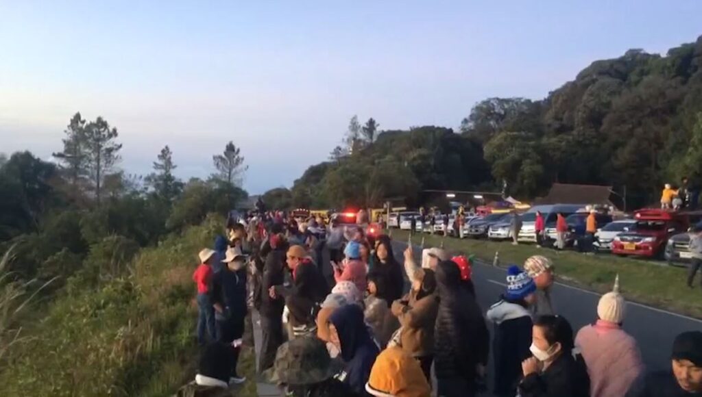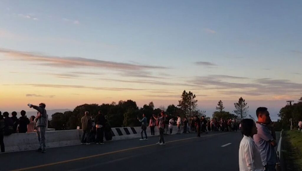 ส่วนจุดชมวิวกิ่วแม่ปานเช้านี้ 10 องศาเซลเซียส นักท่องเที่ยวไปยืนรอ ชมทะเลหมอก และรอสัมผัสแสงแรกจนเต็มพื้นที่ ต่างถ่ายภาพความประทับใจ บางคนต้องนำผ้าห่มมาคลุมร่างกาย และอาศัยไออุ่นจากเตา ร้านค้าของเจ้าหน้าที่ บริเวณลานจอดรถ เพื่อบรรเทาความหนาวเย็น โดยเมื่อวานนี้ (25 พ.ย.) มีนักท่องเที่ยวมากถึง 5,016 คน เป็นคนไทย 3,984 คน ชาวต่างชาติ 1,031 คน และมียานพาหนะมากถึง 1,027 คัน