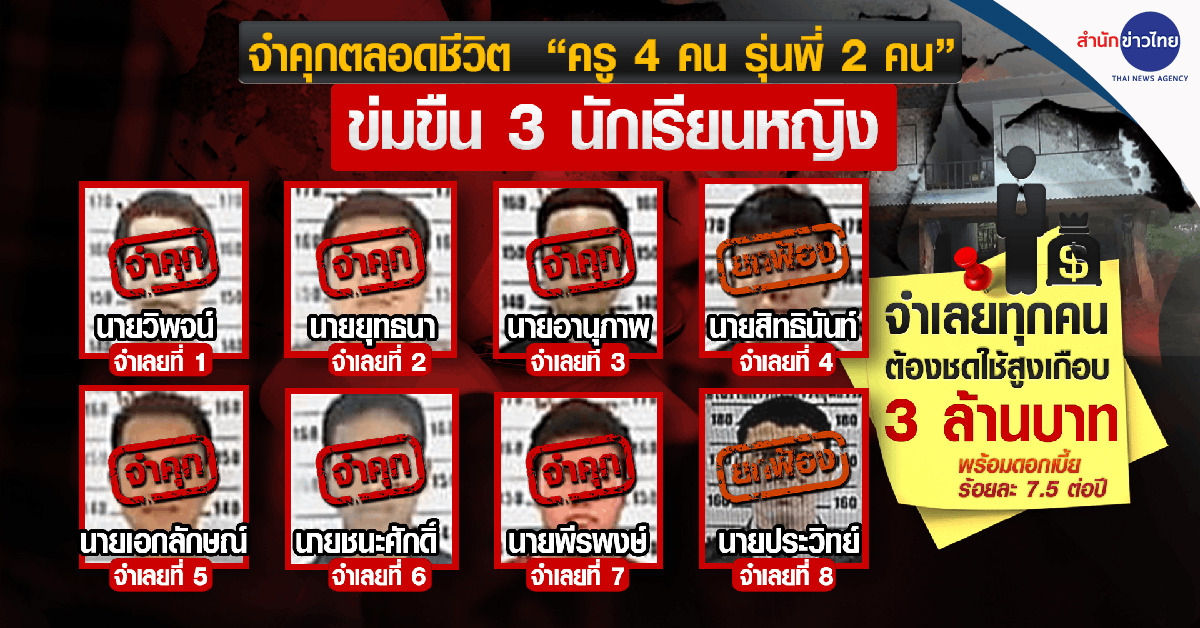 มุกดาหาร 9 ธ.ค. – ศาลจังหวัดมุกดาหาร พิพากษาจำคุกตลอดชีวิต ครู 4 คน รุ่นพี่ 2 คน กระทําชําเรา 3 นักเรียนหญิงนานนับปี พร้อมสั่งชดเชยค่าเสียหายเกือบ 3 ล้านบาท