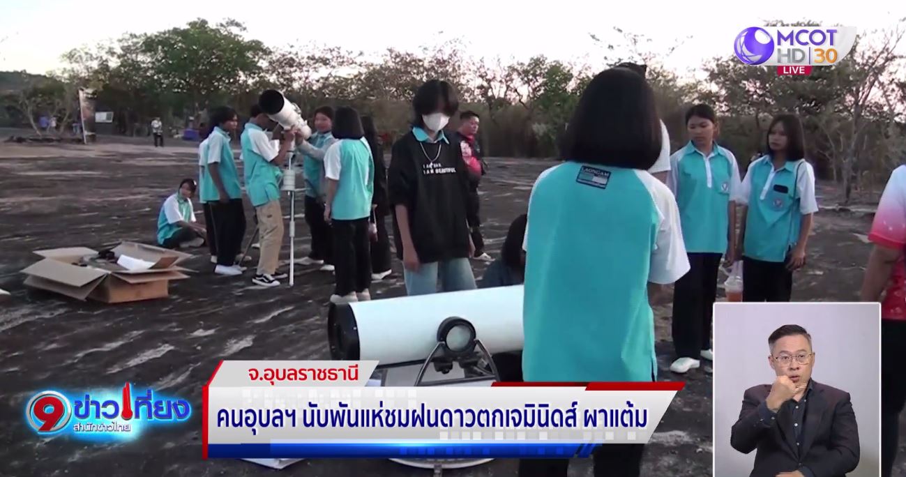 บรรยากาศการชมฝนดาวตกเจมินิดส์ เมื่อคืนนี้ ที่อุทยานแห่งชาติผาแต้ม อ.โขงเจียม จ.อุบลราชธานี องค์การบริหารส่วนจังหวัดอุบลราชธานี ร่วมกับสถาบันวิจัยดาราศาสตร์แห่งชาติ (องค์การมหาชน) และอุทยานแห่งชาติผาแต้ม จัดกิจกรรมชมปรากฏการณ์ฝนดาวตกเจมินิดส์ขึ้น โดยจัดกิจกรรมฐานต่างๆ ชมท้องฟ้าจำลอง เพ้นท์หน้าสีเรืองแสง วาดภาพด้วยแสง การบรรยายดาวและการถ่ายภาพจากผู้เชี่ยวชาญ มีประชาชนและเยาวชนที่สนใจนับพันคน บ้างก็มาเป็นครอบครัว นำเสื่อมาปูนอนรอชม บางกลุ่มก็นำกล้องดูดาวมาด้วยตัวเอง ทำให้จุดชมปรากฏการณ์ฝนดาวตกเจมินิดส์ ที่ผาแต้ม คึกคักตั้งแต่ช่วงหัวค่ำจนถึงดึก เพราะมีฝนดาวตกลงมาติดต่อกันหลายสิบดวง