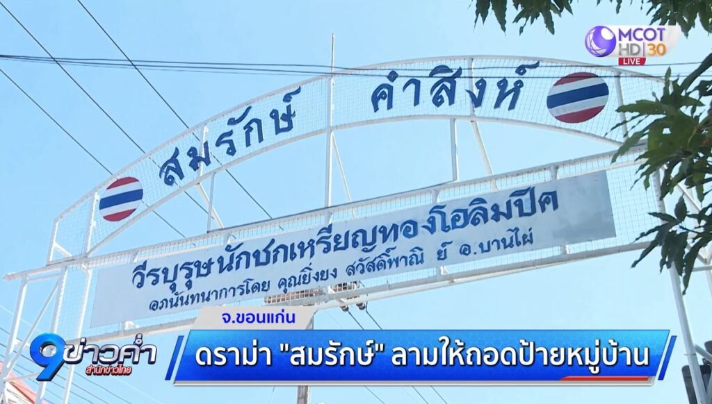 และไม่ได้ดราม่าเฉพาะคำขวัญจังหวัด ได้ยินกับหูว่าพูดกันถึงการถอดป้ายทางเข้าหมู่บ้านที่มีข้อความ “สมรักษ์ คำสิงห์ วีรบุรุษนักชกเหรียญทองโอลิมปิก” จึงพูดปรามว่าป้ายนี้ได้มาด้วยความภาคภูมิใจไม่ใช่ได้มาเพราะความไม่ดี ก็ควรเก็บไว้ดูเป็นอนุสรณ์ของการทำความดี และนอกจากป้ายทางเข้าหมู่บ้าน ในช่วงปี 39 ที่สมรักษ์ คว้าเหรียญทองโอลิมปิก ยังมีคนสร้างถนนยางมะตอยให้ จากถนนมิตรภาพสุดทางรถไฟเขตหมู่บ้านกว่า 1 กม. พร้อมตั้งชื่อถนนว่า “สมรถ-สมรักษ์ คำสิงห์” สร้างความเจริญให้หมู่บ้านเยอะมาก หลังจากนั้นก็ยังมาช่วยเด็ก-เยาวชนในพื้นที่ ไม่เคยขาด สร้างแรงบันดาลใจ มอบรางวัลและอุปกรณ์กีฬา