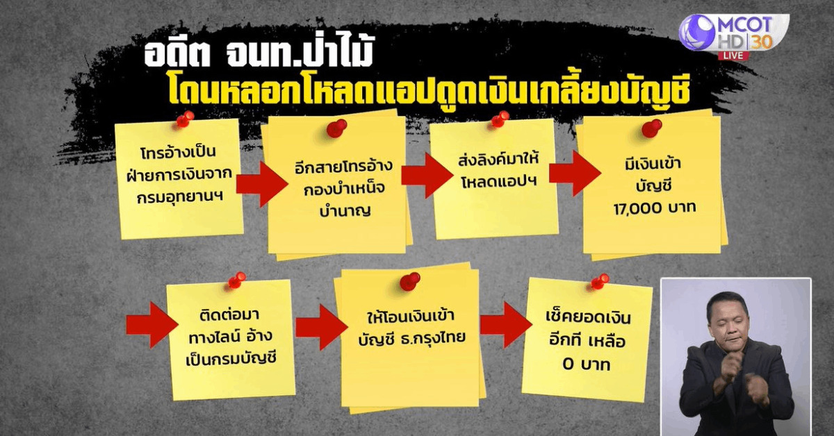 เมื่อวานนี้ (22 ธ.ค.66) นายสมพงษ์ อดีตเจ้าหน้าที่พิทักษ์ป่า เดินทางเข้าแจ้งความกับตำรวจ สภ.กุยบุรี จ.ประจวบคีรีขันธ์ ว่าโดนแก๊งมิจฉาชีพหลอกให้โหลดแอปฯ จากลิงก์ โดยหลอกให้เชื่อว่าเป็นแอปจากกรมบัญชีกลาง เพื่อจะจ่ายเงินค่าตอบแทนหลังจากเกษียณราชการ จากนั้นก็ถูกดูดเงินจากบัญชีจนเกลี้ยง