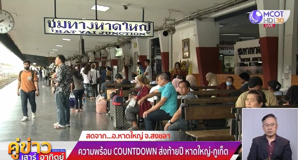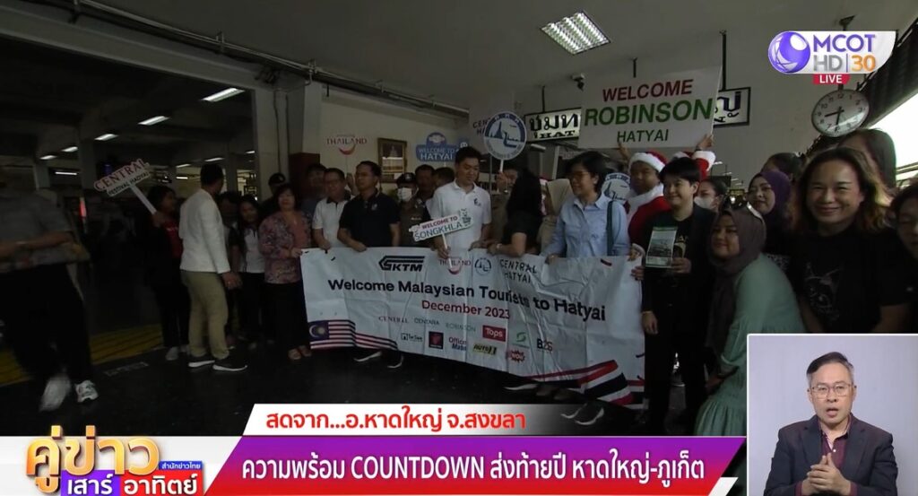 บรรยากาศหาดใหญ่เคาท์ดาวน์ 2024 ด้วยภาพการต้อนรับนักท่องเที่ยวกลุ่มใหญ่ที่ส่วนใหญ่เป็นชาวมาเลเซีย รวมทั้งสิ้น 415 คน เดินทางมากับรถไฟขบวนพิเศษชื่อว่า MY Sawasdee ออกจากสถานี Sentral KL กรุงกัวลาลัมเปอร์ จำนวน 11 โบกี้ มายังสถานีรถไฟชุมทางหาดใหญ่ จ.สงขลา เพื่อเฉลิมฉลองเทศกาลแห่งความสุข ส่งท้ายปีเก่าต้อนรับปีใหม่ โดยนางนงเยาว์ จิรันดร ผู้อำนวยการ ททท.สำนักงานหาดใหญ่ พร้อมด้วยผู้บริหารสถานีรถไฟชุมทางหาดใหญ่ หน่วยงานภาครัฐและภาคเอกชน ร่วมกันให้การต้อนรับนักท่องเที่ยวกลุ่มนี้อย่างอบอุ่น