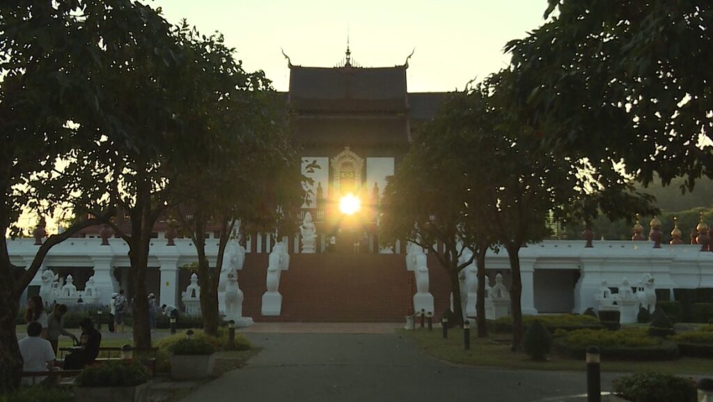 เหลือเวลาอีกไม่กี่ชั่วโมงที่จะนับถอยหลังก้าวเข้าสู่ปีใหม่ ที่ จ.เชียงใหม่ ปีนี้คึกคักมากกว่าทุกปี โดยฉพาะที่สวนเฉลิมพระเกียรติ 82 พรรษา ซึ่งเต็มไปด้วยความสวยงามของดอกไม้ ยิ่งค่ำยิ่งสวยงามด้วยสวนแสงไฟยิ่งใหญ่อลังการ แต่ขอพาไปชม แสงสุดท้ายของปีที่หอคำหลวงในอุทยานหลวงราชพฤกษ์ แสงอาทิตย์ที่ค่อยๆ ลาลับขอบฟ้าแสงสุดท้ายในวันสิ้นปี 2566 ลอดผ่านช่องประตูด้านข้างหอคำหลวง เป็นเหมือนสัญญาณว่าเรากำลังจะลาปีเก่าเพื่อต้อนรับปีใหม่ในอีกไม่กี่ชั่วโมงข้างหน้า ท่ามกลางแสงไฟที่ประดับไปทั่วบริเวณอย่างสวยงาม