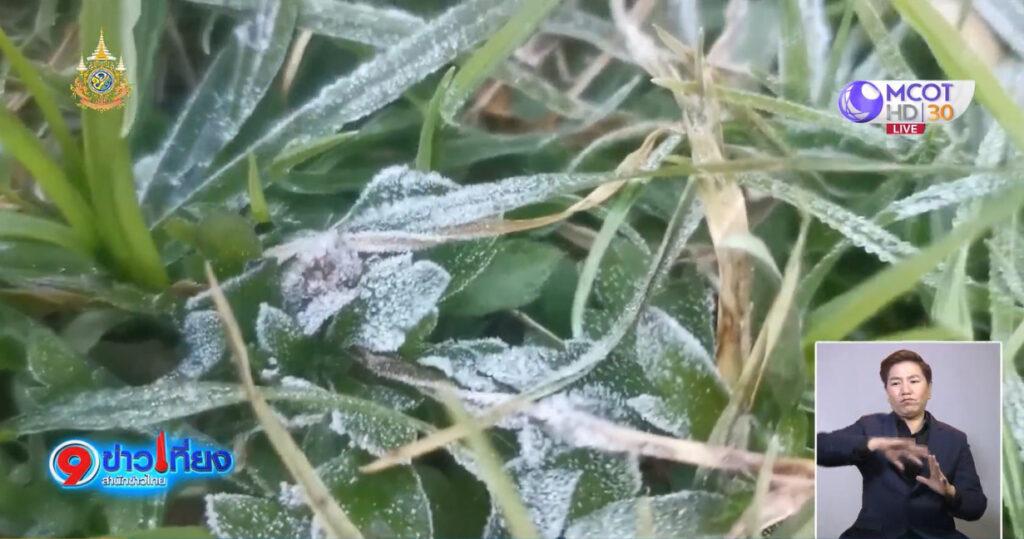 ส่วนบนยอดดอยจุดสูงสุด อุณหภูมิยังเลขตัวเดียว 7 องศาเซลเซียส แต่ไม่มีกระแสลม ทำให้เกิดน้ำค้างแข็งบริเวณหน้าสถานีเรดาร์ ตามต้นหญ้าใบไม้ เมื่อถูกแสงแดดอ่อน ๆ ยังไม่ละลาย สะท้อนแสงเป็นประกายเหมือนเพชร นักท่องเที่ยวตื่นเต้นมาก พากันบันทึกภาพความสวยงามนำไปโพส์ในโซเซียล สำหรับน้ำค้างแข็งเกิดขึ้น เป็นครั้งที่ 10 ของฤดูหนาวปีนี้ ขณะที่เมื่อวานนี้ นักท่องเที่ยว ขึ้นไปสัมผัสอากาศหนาว มากถึง 6,768 คน