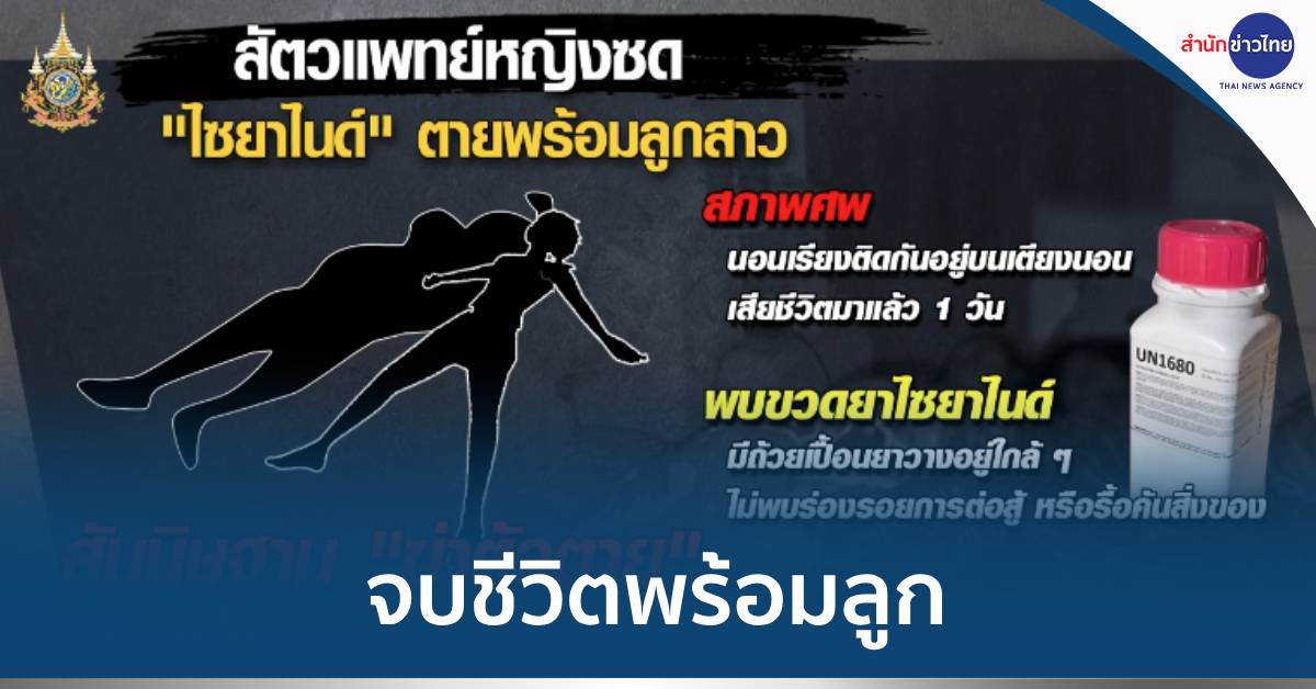ระยอง 2 ม.ค.-สัตวแพทย์สาว จ.ระยอง เสียชีวิตพร้อมลูกสาว และนกที่เลี้ยงไว้อีก 2 ตัว พบขวดยาไซยาไนด์ พร้อมทิ้งข้อความสั่งเสียเผาทันที ไม่ต้องสวด ใส่โลงเดียวกัน เบื้องต้นสันนิษฐาน เครียดจากปัญหาชีวิตและการเงิน