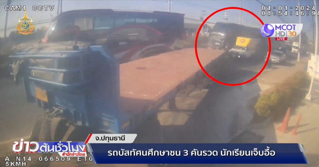 ปทุมธานี 4 ม.ค. – รถบัสทัศนศึกษาโรงเรียนดัง ชนท้ายกัน 3 คัน หลังกระบะตู้ทึบตัดหน้า ต้องเบรกกะทันหัน นักเรียนบาดเจ็บกว่าสิบคน แต่อาการไม่สาหัส
