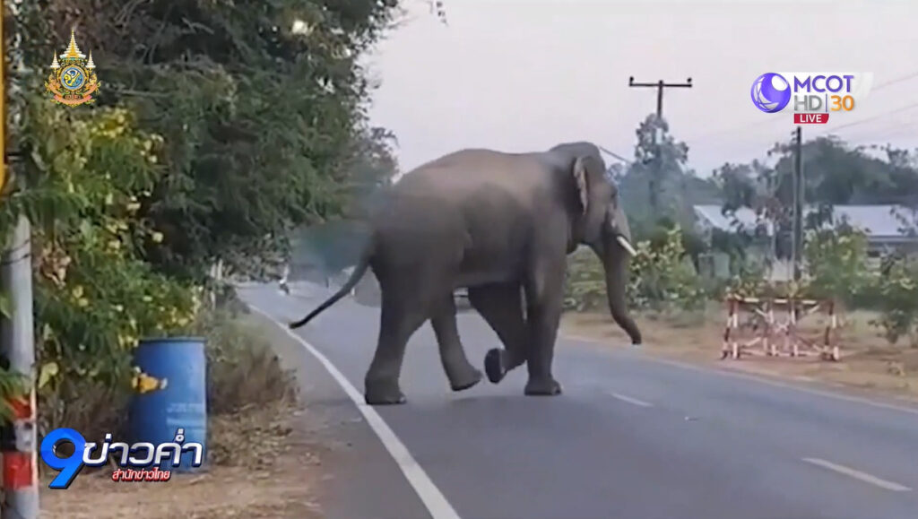 โขลงช้างป่ากว่า 30 ตัว เดินข้ามถนนกลับเข้าไปในแนวคูกั้นช้าง ขณะที่เจ้าหน้าที่ทีมอาสาชุดเฝ้าระวังช้างป่า กำนัน ผู้ใหญ่บ้าน เข้าทำการผลักดัน หลังได้รับแจ้งจากชาวบ้านว่า มีช้างป่าตัวหนึ่งมีลักษณะตกมันส่งเสียงร้องดังลั่นสนั่นป่า และทะเลาะกันเหมือนกับว่า กำลังจะแย่งความเป็นผู้นำจ่าโขลง อาจทำอันตรายกับคนได้