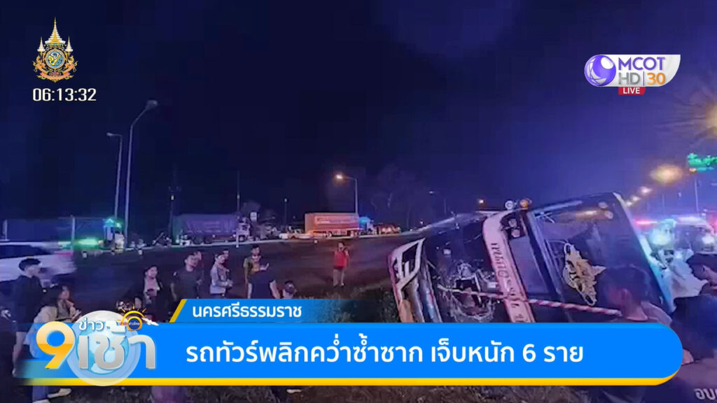 นครศรีธรรมราช 8 ม.ค. – เหตุการณ์ซ้ำซาก รถทัวร์พลิกคว่ำ ที่ จ.นครศรีธรรมราช หวิดตายหมู่ พบผู้โดยสารเจ็บหนัก 6 ราย คาดคนขับหลับใน