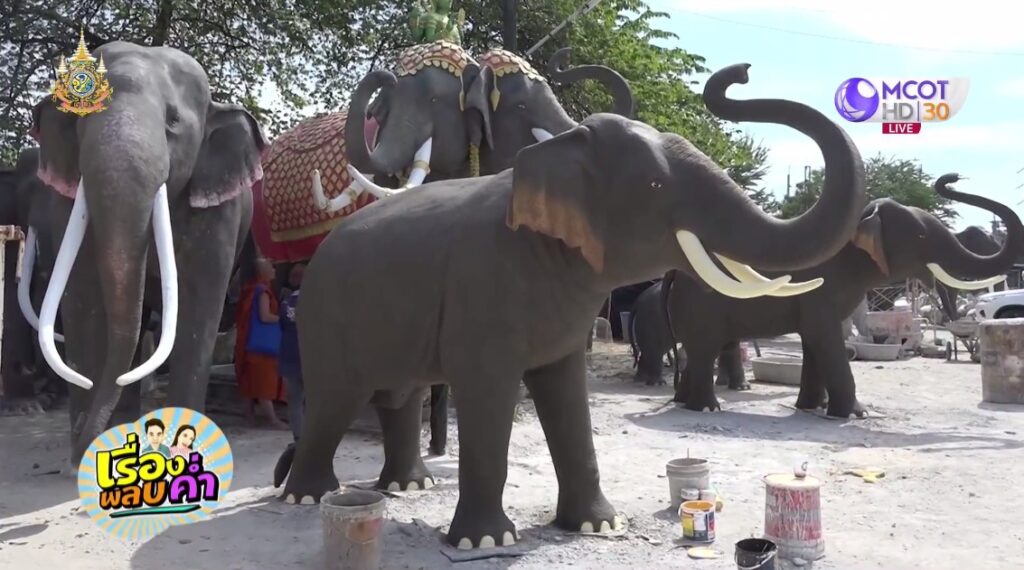 ปั้นจากปูนซีเมนต์ทั้งหมด เริ่มตั้งแต่วางโครงสร้างจากเหล็ก สานเป็นรูปร่างตัวช้าง ก่อนนำปูนมาปั้นตามแบบโครงร่าง แล้วตกแต่งสี เขียนลวดลายพื้นผิว จนเหมือนช้างตัวจริงมากๆ รับปั้นตามลูกค้าต้องการ เช่น ขนาดความสูง 1.50 เมตร ราคาตัวละ 20,000 บาท ขนาดสูง 2 เมตร ตัวละ 40,000-50,000 บาท ขนาดใหญ่สุดสูง 3.50 เมตร ตัวละ 100,000 บาท หรือช้างตัวใหญ่แม่ลูกชุดละ 150,000 บาท หรือหากต้องการขนาดใหญ่กว่านี้ก็มีทีมช่างออกไปปั้นงานให้ถึงที่ตั้ง เพราะตัวใหญ่กว่านี้จะเป็นอุปสรรคขนส่งยากลำบาก