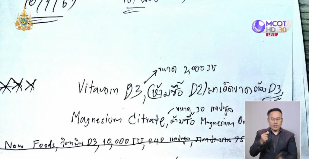 ซึ่งล่าสุด ทนายความที่ร่วมรับฟังการสอบปากคำของจอห์นหีบเหล็ก ตามสิทธิ์ผู้ต้องหา เมื่อวานนี้ ซึ่งระหว่างจอห์น ถูกคุมตัวไปฝากขัง ได้ร้องขอกับทางทนายว่า ให้ซื้อยาวิตามินให้กิน ระหว่างถูกคุมตัว ที่ สภ.พังโคน และได้จดรายชื่อยาด้วยลายมือตัวเอง ตามที่เขียนในกระดาษ คือ วิตามิน D3 ห้ามซื้อ D2 มาเด็ดขาด ต้อง D3 เท่านั้น ยาอีกตัว แมกนีเซียมซิเตรต 30 แคปซูล ห้ามซื้อแมกนีเซียมออกไซด์ เด็ดขาด ซึ่งยาเหล่านี้เป็นยาอาหารเสริม วิตามินที่ใช้บำรุงสมองและกระดูก
