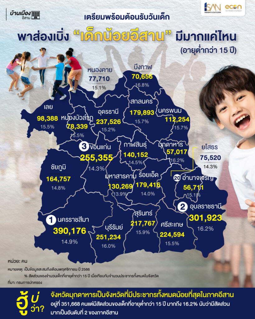 ทั้งนี้ คณะเศรษฐศาสตร์ ม.ขอนแก่น ตั้งข้อสังเกตว่า จังหวัดที่มีเด็กมากก็แปรผันตามจำนวนประชากร รวมทั้ง จ.นครราชสีมา ขอนแก่น อุบลฯ แต่ จ.อุบลฯ กลับเป็นจังหวัดใหญ่ที่มีสัดส่วนประชากรเด็กมากกว่าอีก 2 จังหวัด และบึงกาฬ มีสัดส่วนเด็กต่อประชากรสูงที่สุด ถึง 16.8% ซึ่งถือเป็นสัดส่วนที่มากที่สุดในอีสาน โดยมี มุกดาหาร อุบลฯ และบุรีรัมย์ เป็นลำดับถัดมา ส่วนจังหวัดที่มีสัดส่วนเด็กน้อยต่อประชากรน้อยที่สุด กลับเป็น มหาสารคาม ร้อยเอ็ด ขอนแก่น กาฬสินธุ์ และโคราช ตามลำดับ โดยมีสัดส่วนเด็กต่อประชากรต่ำกว่า 15% ซึ่งจะส่งผลต่อโครงสร้างประชากร ซึ่งอาจสร้างผลกระทบหลายด้านต่อสภาพเศรษฐกิจและสังคมในอนาคต รวมทั้งยังเป็นความท้าทายของสังคมที่ก้าวเข้าสู่สังคมผู้สูงอายุ