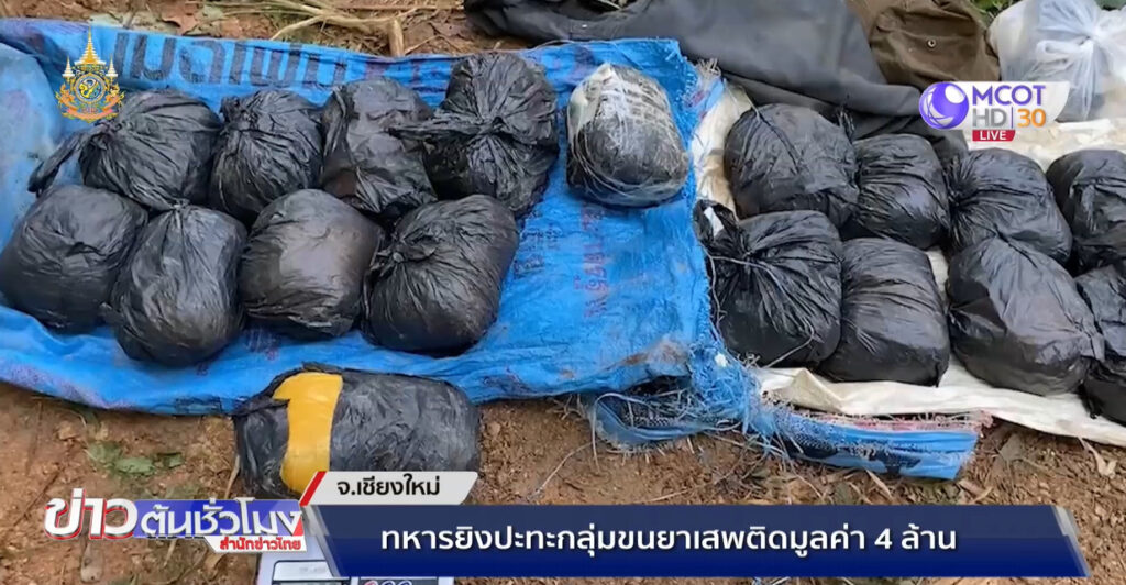 เชียงใหม่ 18 ม.ค. – ทหารกองกำลังผาเมือง ยิงปะทะขบวนการขนยาเสพติด คนร้ายหลบหนี ทิ้งกระเป๋าบรรจุยาบ้า 3 แสนเม็ด ฝิ่นดิบ 32 กก. รวมมูลค่ากว่า 4 ล้านบาท