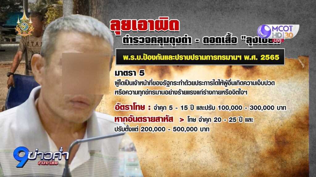 หากตำรวจนายนี้กระทำผิดจริง อาจเข้าข่ายตาม พ.ร.บ.ป้องกันและปราบปรามการทรมานและการกระทำให้บุคคลสูญหาย พ.ศ. 2565 จำนวน 2 มาตรา คือ มาตรา 5 ผู้ใดเป็นเจ้าหน้าที่ของรัฐกระทำด้วยประการใดให้ผู้อื่นเกิดความเจ็บปวด หรือความทุกข์ทรมานอย่างร้ายแรงแก่ร่างกายหรือจิตใจฯ โทษจำคุก 5-15 ปี และปรับตั้งแต่ 100,000-300,000 บาท หากเหยื่ออันตรายสาหัส มีโทษจำคุก 20-25 ปี และปรับตั้งแต่ 200,000-500,000 บาท ส่วนอีกมาตรา คือ มาตรา 6 ผู้ใดเป็นเจ้าหน้าที่ของรัฐลงโทษ หรือกระทำด้วยประการใดที่โหดร้าย ไร้มนุษยธรรม หรือย่ำยีศักดิ์ศรีความเป็นมนุษย์ฯ มีโทษจำคุกไม่เกิน 3 ปี หรือปรับไม่เกิน 60,000 บาท หรือทั้งจำทั้งปรับ