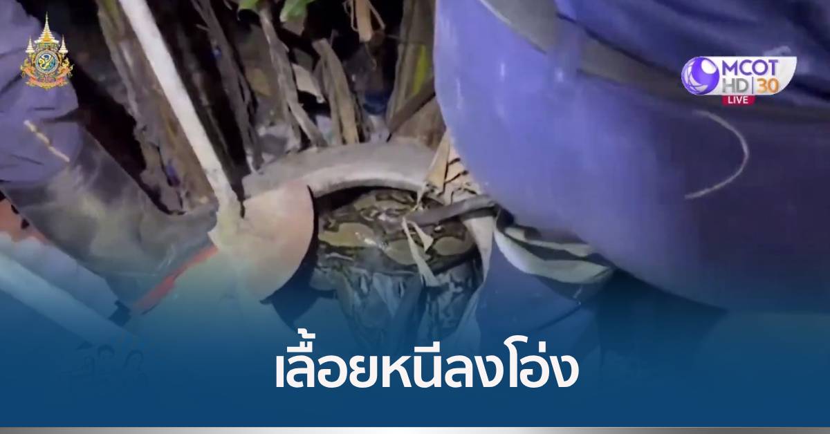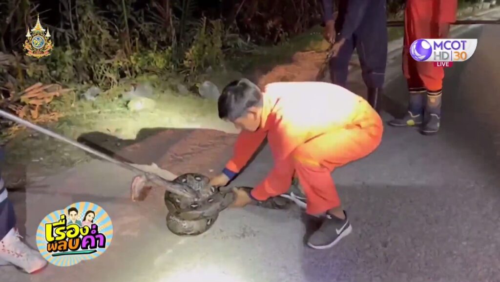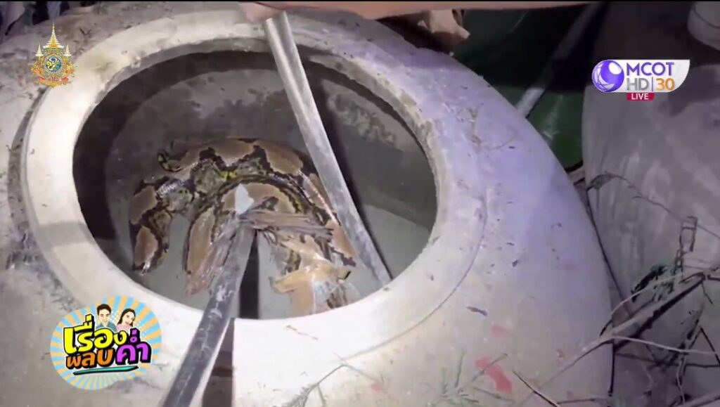 สมุทรสงคราม 23 ม.ค. – พบงูเหลือมยักษ์ ยาวเกือบ 5 เมตร ชาวบ้านใช้ไม้ไล่ตี เลื้อยหนีลงโอ่ง แจ้งกู้ภัยมาจับ แต่งูตัวใหญ่แรงเยอะ ขอกำลังเสริม ระดมจับก่อนปล่อยสู่ธรรมชาติ