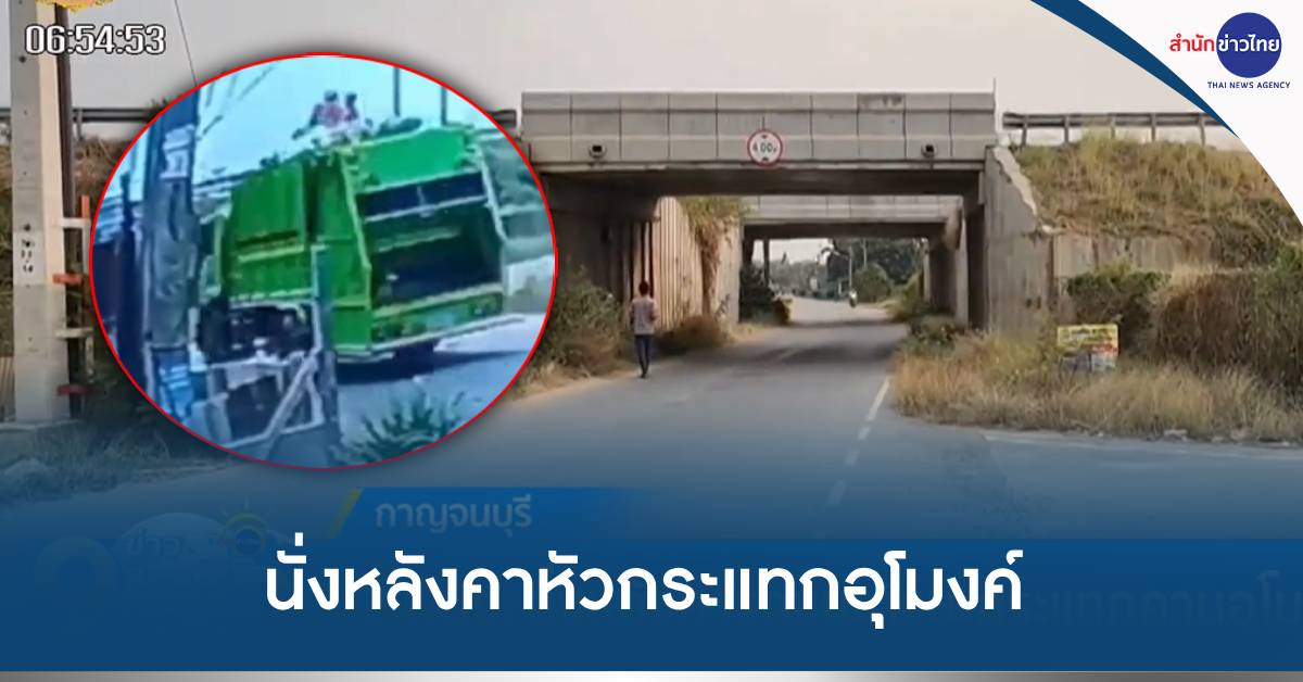 กาญจนบุรี 24 ม.ค.-พนักงานเก็บขยะ 2 คน นั่งบนหลังคารถขยะ ขณะรถแล่นผ่านอุโมงค์ทางลอดสูง 4 เมตร หลบไม่พ้นศีรษะกระแทกคานเสียชีวิตทั้งคู่