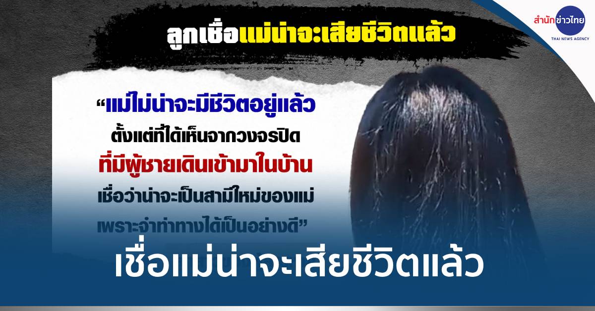 ลูกสาวตอบอย่างหมดหวังว่าคิดว่าแม่ไม่น่าจะมีชีวิตอยู่แล้ว ตั้งแต่ที่ได้เห็นภาพจากกล้องวงจรปิดที่มีผู้ชายเดินเข้ามาในบ้านแล้วแม่หายตัวไป หากมองในภาพแล้วเชื่อว่าน่าจะเป็นสามีใหม่ของแม่ เพราะเคยอยู่ด้วยกันจึงรู้จักและจำกิริยาท่าทางได้เป็นอย่างดี.–สำนักข่าวไทย