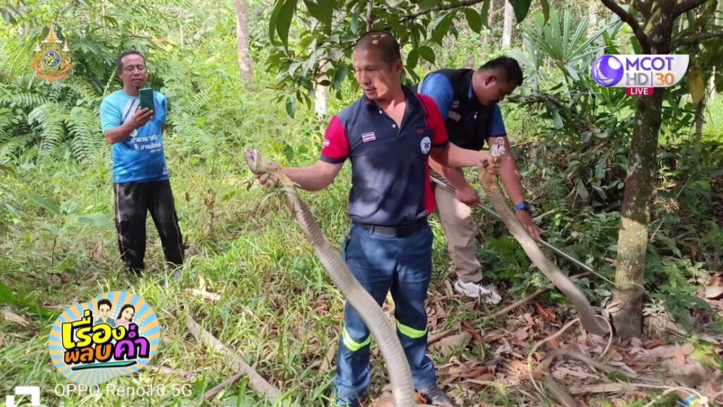 หน่วยกู้ชีพไม้ขม บอกว่า เป็นครั้งแรกที่จับงูจงอางทีเดียวพร้อมกันถึงสองตัว จับยากมากเพราะมันกำลังพลอดรักกัน อยู่ไม่นิ่ง ชูคอรัดกันไปมาตลอดเวลา ก่อนนำไปปล่อยในป่าห่างไกลจากบ้านของชาวบ้าน. – สำนักข่าวไทย