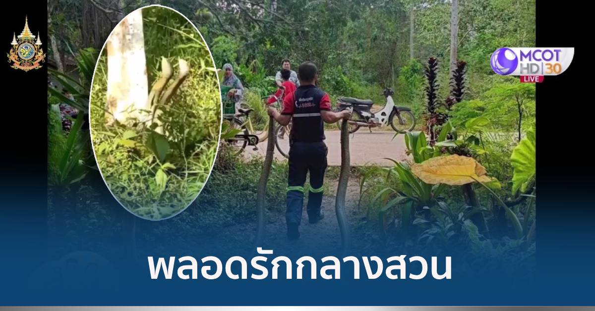 สงขลา 29 ม.ค. – งูจงอางยักษ์พลอดรักในสวนลองกอง อ.สะเดา จ.สงขลา ไม่แคร์สายตาชาวบ้านแห่ดู ยังชูคอรัดกันตัวเป็นเกลียว หน่วยกู้ชีพไม้ขมมาจับ ยอมรับจับยาก เพราะเป็นครั้งแรกที่จับพร้อมกันสองตัว