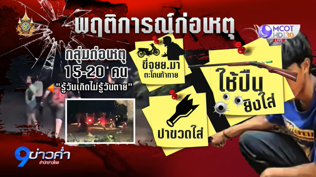 ชาวบ้านที่ถูกลูกหลง มีบาดแผลถูกยิงเข้าที่ชายโครงขวา และมีรอยเขียวช้ำที่ต้นขาซ้ายและขาขวา เล่าว่า คืนที่ผ่านมาออกมาซื้อของที่ร้านค้าในหมู่บ้านได้ยินเสียงวัยรุ่นเสียงดังจึงเดินออกมาดูและเห็นกลุ่มวัยรุ่นทะเลาะวิวาทกัน จึงเดินไปหาลูกสาวที่อยู่อีกฝั่งหนึ่ง ขณะนั้นได้ยินเสียงปืนดังขึ้น และรู้สึกเจ็บที่ชายโครงและต้นขาเมื่อเปิดดูก็พบว่าตนเองถูกยิง