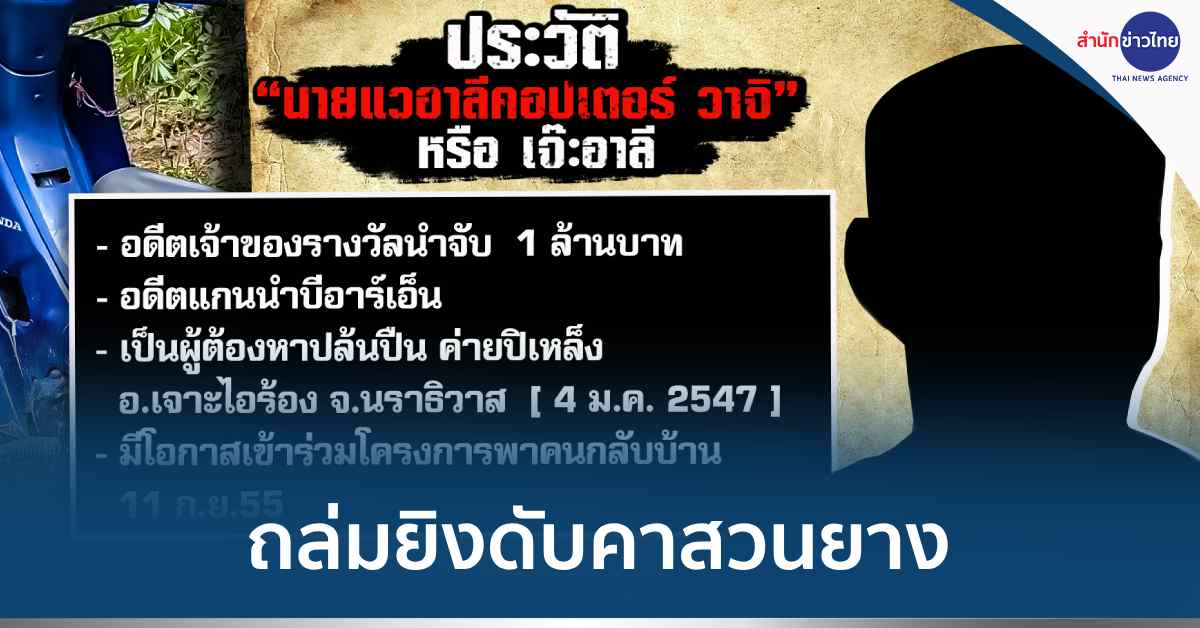 เมื่อช่วงเช้าที่ผ่านมา ตำรวจ สภ.รือเสาะ จ.นราธิวาส รับแจ้งมีเหตุคนถูกยิงเสียชีวิตภายในร่องทางเดินป่าละเมาะสวนยางพาราบ้านปูโปะ ต.รือเสาะออก ทราบชื่อ นายแวอาลีคอปเตอร์ อายุ 67 ปี เป็นอดีตแกนนำกลุ่มขบวนการก่อความไม่สงบ บี.อาร์.เอ็น. มีบาดแผลถูกยิงด้วยอาวุธปืนสงคราม เอ็ม16 และอาก้า ที่บริเวณลำตัวและใบหน้าพรุน ห่างจากศพมีรถ จยย. ล้มตะแคงอยู่ และถูกกระสุนปืนของคนร้ายเป็นรูจำนวนหลายแห่ง
