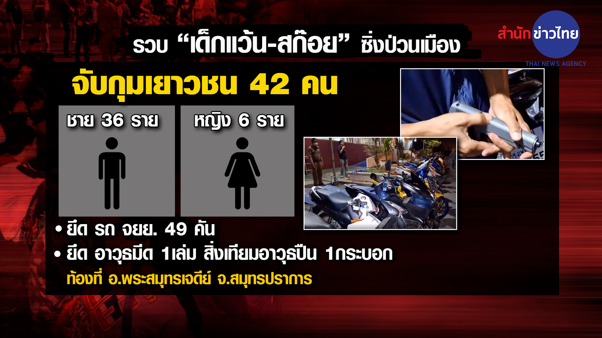 เมื่อเวลา 03.30 น. วันที่ 12 ก.พ.67 พ.ต.อ.ทศพล ทองใบ ผกก.สภ.พระสมุทรเจดีย์ จ.สมุทรปราการ พ.ต.ท.ประยุร ปัตตุลี รอง.ผกก.สส. พ.ต.ท.ฐากร เขียนสะอาด สวป. พ.ต.ท.องอาจ ศรีทอง สว.จร. พ.ต.ต.กิตติกานต์ กองเศรษฐ์ สว.ชุมชนสัมพันธ์ ได้สนธิกำลังตำรวจงานสืบสวน งานป้องกันและปราบปรามและงานจราจร สภ.พระสมุทรเจดีย์ เกือบ 100 นาย วางแผนจับกุมกลุ่มเด็กแว้นซิ่งป่วนเมือง บริเวณถนนสุขสวัสดิ์ด้านขาเข้ากรุงเทพมหานคร ตั้งแต่บริเวณสามแยกพระสมุทรเจดีย์ไปจนถึงปากซอยร่มเย็น ก่อนจับกุมรถจักรยานยนต์ได้จำนวน 49 คัน และกลุ่มเด็กแว้น เป็นเด็กและเยาวชนอายุตั้งแต่ 15-21 ปี จำนวน 42 คน หลังมีการรวมตัวแข่งขันรถจักรยานยนต์ สร้างความเดือดร้อนรำคาญให้กับผู้ใช้รถใช้ถนนและประชาชนที่พักอาศัยอยู่ริมถนนสุขสวัสดิ์