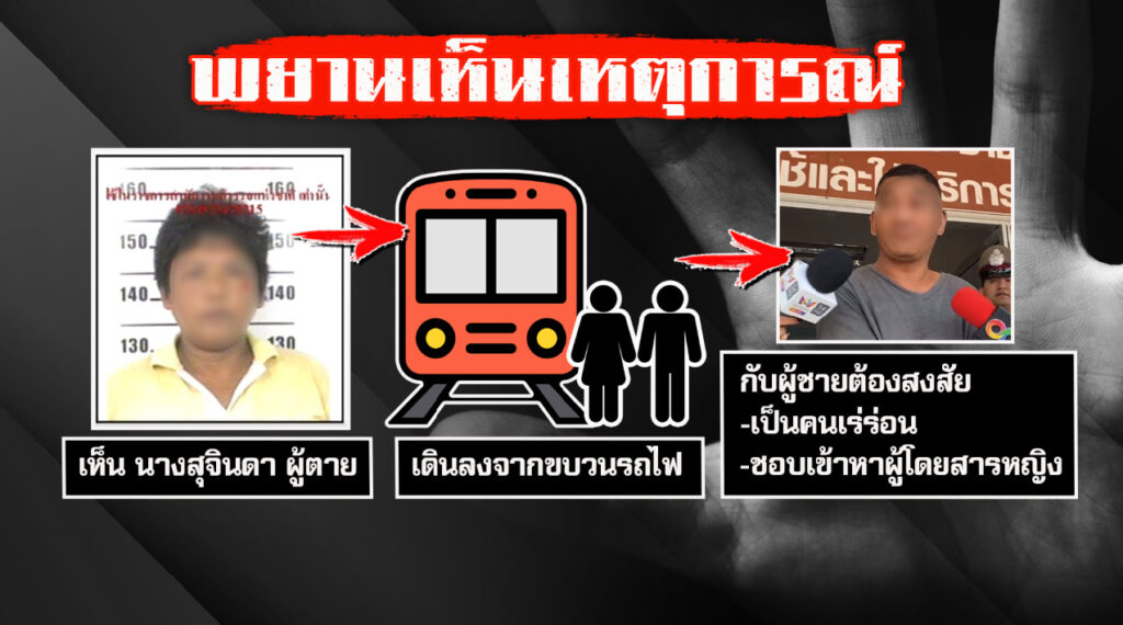 สอบสวนเบื้องต้น พบว่าผู้เสียชีวิตเป็นหญิงเร่ร่อนนอนตามสถานีรถไฟมาเป็นเวลา 3-4 ปี ก่อนเกิดเหตุมีพยาน เห็นผู้เสียชีวิต เดินลงจากขบวนรถไฟขาขึ้นกรุงเทพฯ กับผู้ชายต้องสงสัย ซึ่งเป็นคนเร่ร่อนตามสถานีรถไฟ และมีพฤติกรรมชอบเข้าหาผู้โดยสารผู้หญิง โดยพบว่า ช่วงเวลาประมาณ 21.00 น. คืนวันที่ 14 กุมภาพันธ์ ทั้ง 2 คนได้เดินขึ้นไปยังบริเวณที่เกิดเหตุ จากนั้นเวลาประมาณ 02.00 น. ฝ่ายชายเดินกลับมาคนเดียว โดยมีท่าทีกระวนกระวายและได้ขึ้นขบวนรถไฟเที่ยว 06.00 น. ขาล่องใต้ออกไป