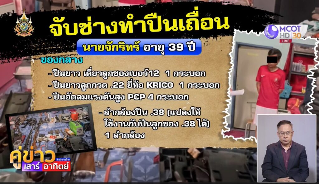 ตำรวจอาชญากรรมทางเทคโนโลยี นำหมายค้นศาลจังหวัดชลบุรี เข้าค้นหอพักเจ๊นวล เลขที่ 4/4 ม.2 ต.ดอนหัวฬ่อ อ.เมืองชลบุรี จ.ชลบุรี จับกุมตัวนายจักริทร์ อายุ 39 ปี พร้อมของกลางอาวุธปืนยาว, อาวุธปืนยาวและอีกหลายประเภท, กระสุนปืนลูกซองขนาดต่าง ๆ จำนวนมาก พร้อมชิ้นส่วนประกอบของปืน และอุปกรณ์ใช้ในการผลิตอาวุธปืน