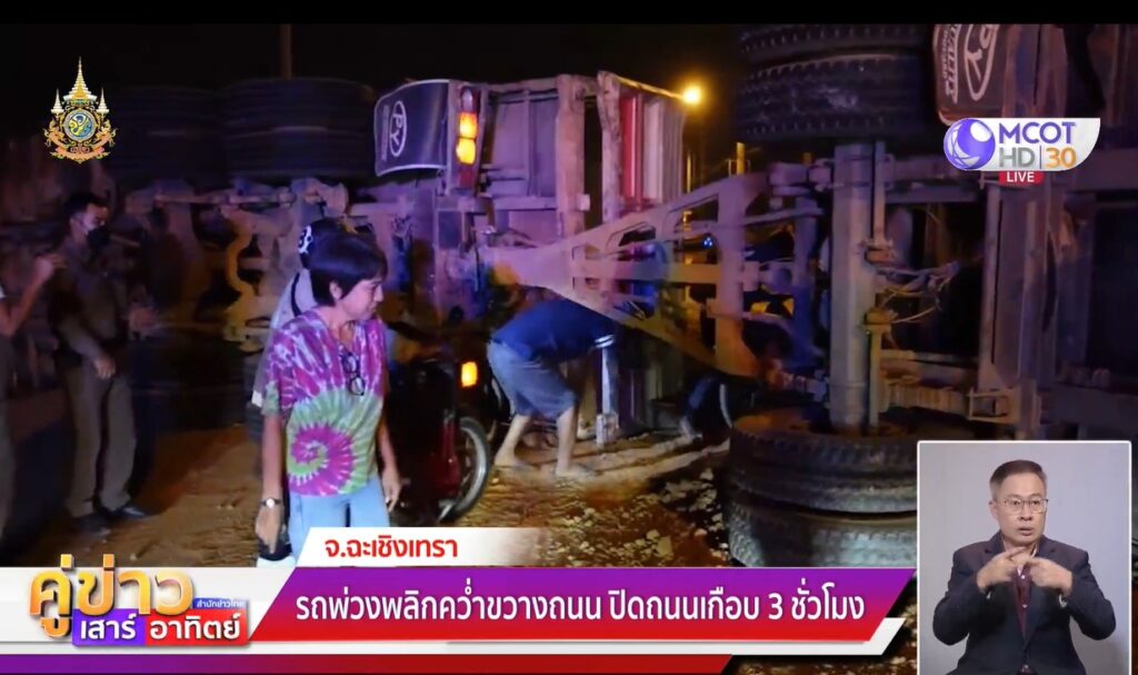 ภาพวงจรปิดเมื่อเวลาประมาณ 05.30 น. วันที่ 17 ก.พ. 67 บริเวณทางโค้ง สะพานข้ามคลองบางกนก ถนนสายบ้านโพธิ์-หัวเนิน หมู่ 4 ต.สนามจันทร์ อ.บ้านโพธิ์ จ.ฉะเชิงเทรา จับภาพนาทีที่รถพ่วง 22 ล้อ ฮีโน่ สีขาว ทะเบียนตัวแม่ 89-9882 นครปฐม ทะเบียนตัวพ่วง 82-1574 สุโขทัย มีนายกิตติศักดิ์ ทรงธรรม อายุ 27 ปี เป็นคนขับ มุ่งหน้าไปทางสามแยกหัวเนิน แต่ช่วงที่ขับเข้าทางโค้งนายกิตติศักดิ์ ได้เหยียบเบรกชะลอความเร็ว แต่รถเกิดลื่นน้ำบนถนนทำให้ตัวแม่เสียหลักหมุนแล้วทำให้ตัวงพ่วงเหวี่ยงข้ามเลนก่อนจะไปเฉี่ยวชนรถตู้โตโยต้า สีขาว ทะเบียน นข 3814 ปราจีนบุรี ของนายโนรม ชูชวน อายุ 53 ปี ที่กำลังไปส่งพนักงานขับมุ่งหน้าไปสี่แยกบ้านโพธิ์ จนรถพังเสียหาย ส่วนรถพ่วง 22 ล้อ ได้เสียหลักพลิกคว่ำขวางถนน ทำให้ลูกรังที่บรรทุกมา ตกกระจายเกลื่อนถนน จนไม่สามารถใช้เส้นทางสัญจรไปมาได้ เจ้าหน้าที่ต้องเร่งยกรถออกเพื่อเปิดเส้นทางการจราจร โดยใช้เวลาเกือบ 3 ชั่วโมง อุบัติเหตุครั้งมีผู้ได้รับบาดเจ็บ 1 ราย ถูกนำตัวส่งโรงพยาบาลบ้านโพธิ์. -สำนักข่าวไทย